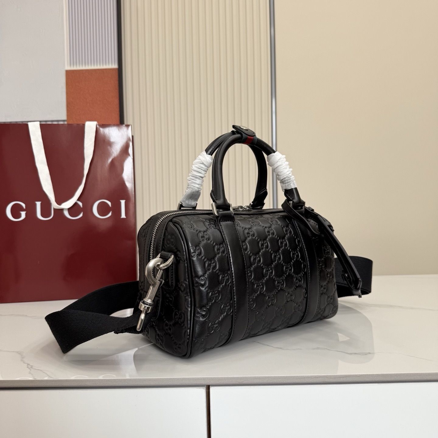 This GG Emblem Small Duffle Bag is crafted from luxurious black embossed GG smooth leather, finished with black leather trim for a refined monochrome look that feels both modern and timeless. The compact duffle silhouette offers a polished interpretation of travel style, while the embossed GG motif highlights Gucci’s heritage of elegance and craftsmanship.