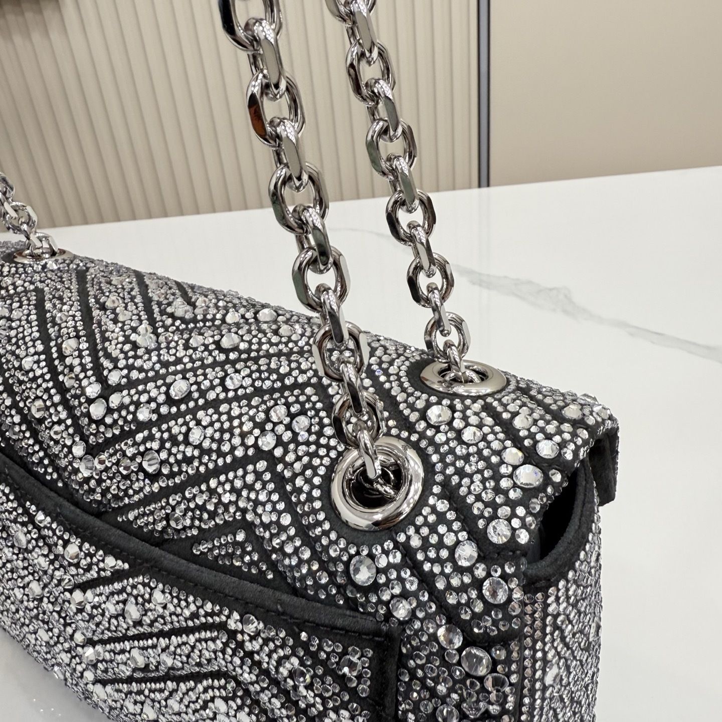 - Material: Matelassé chevron leather construction