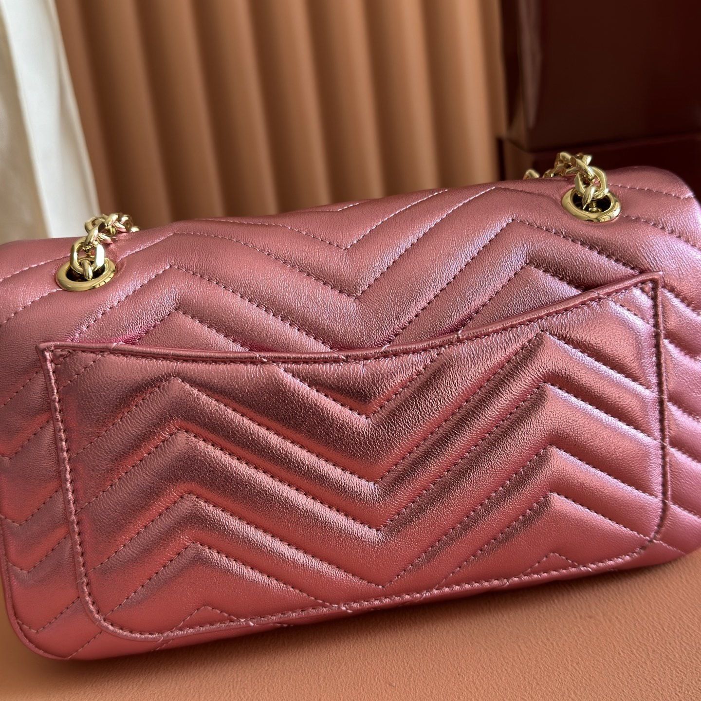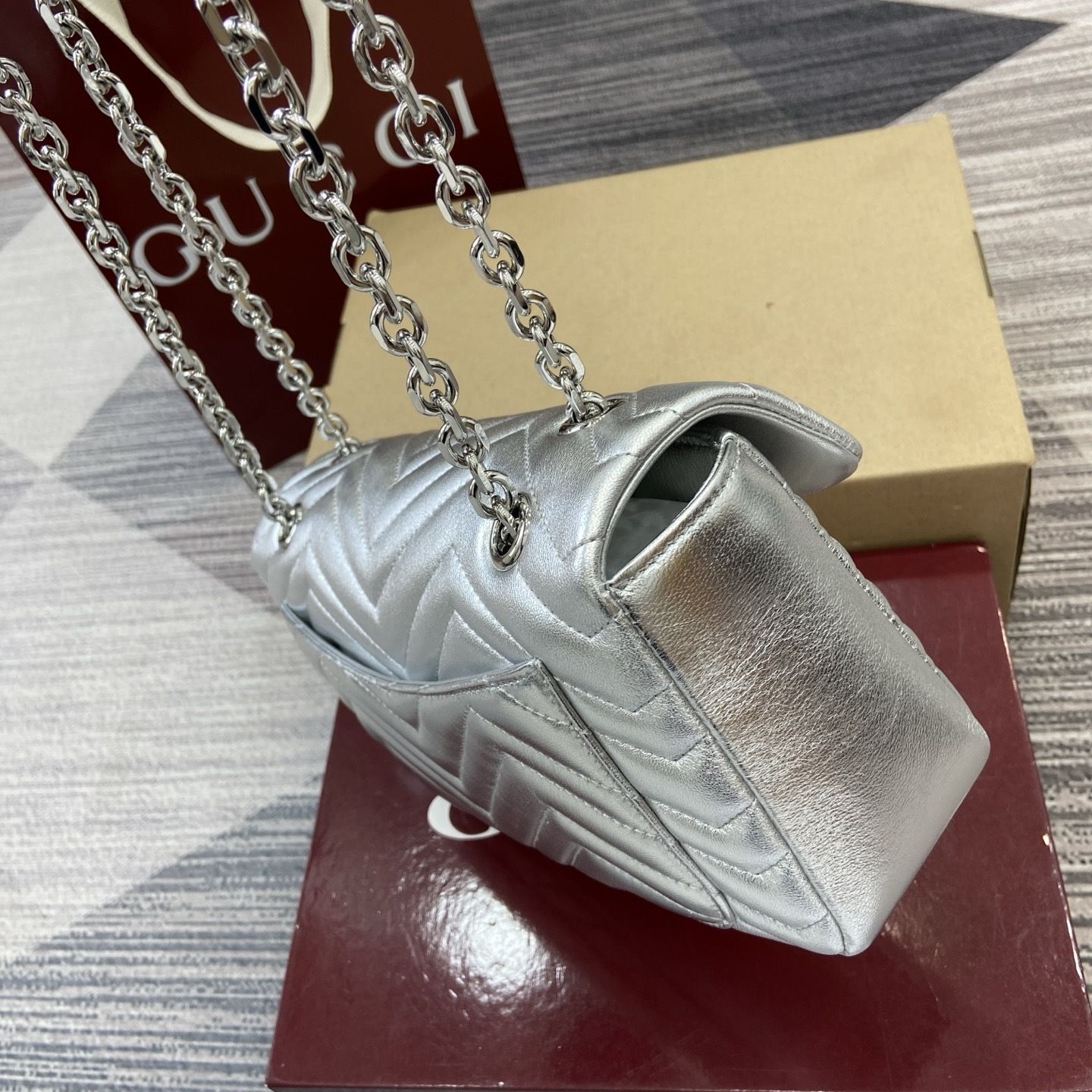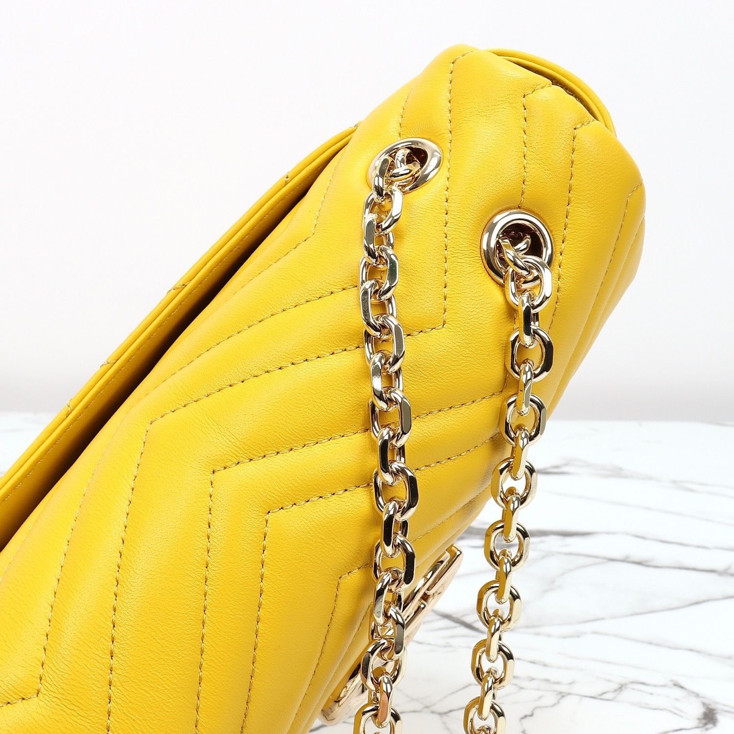 • Material: Matelassé chevron leather construction