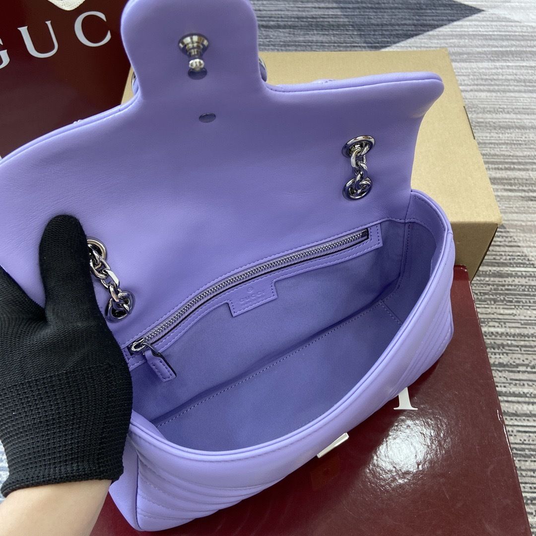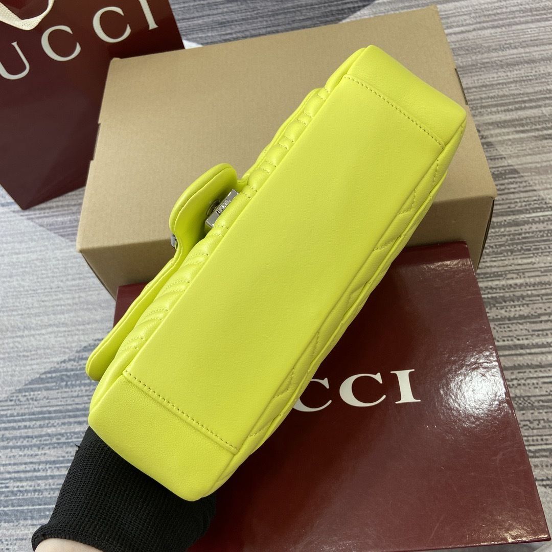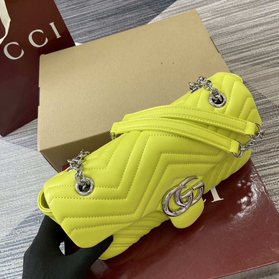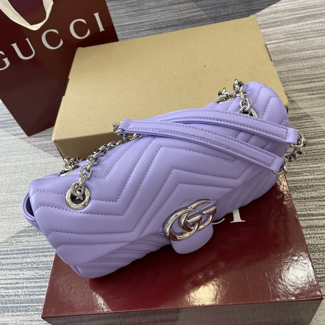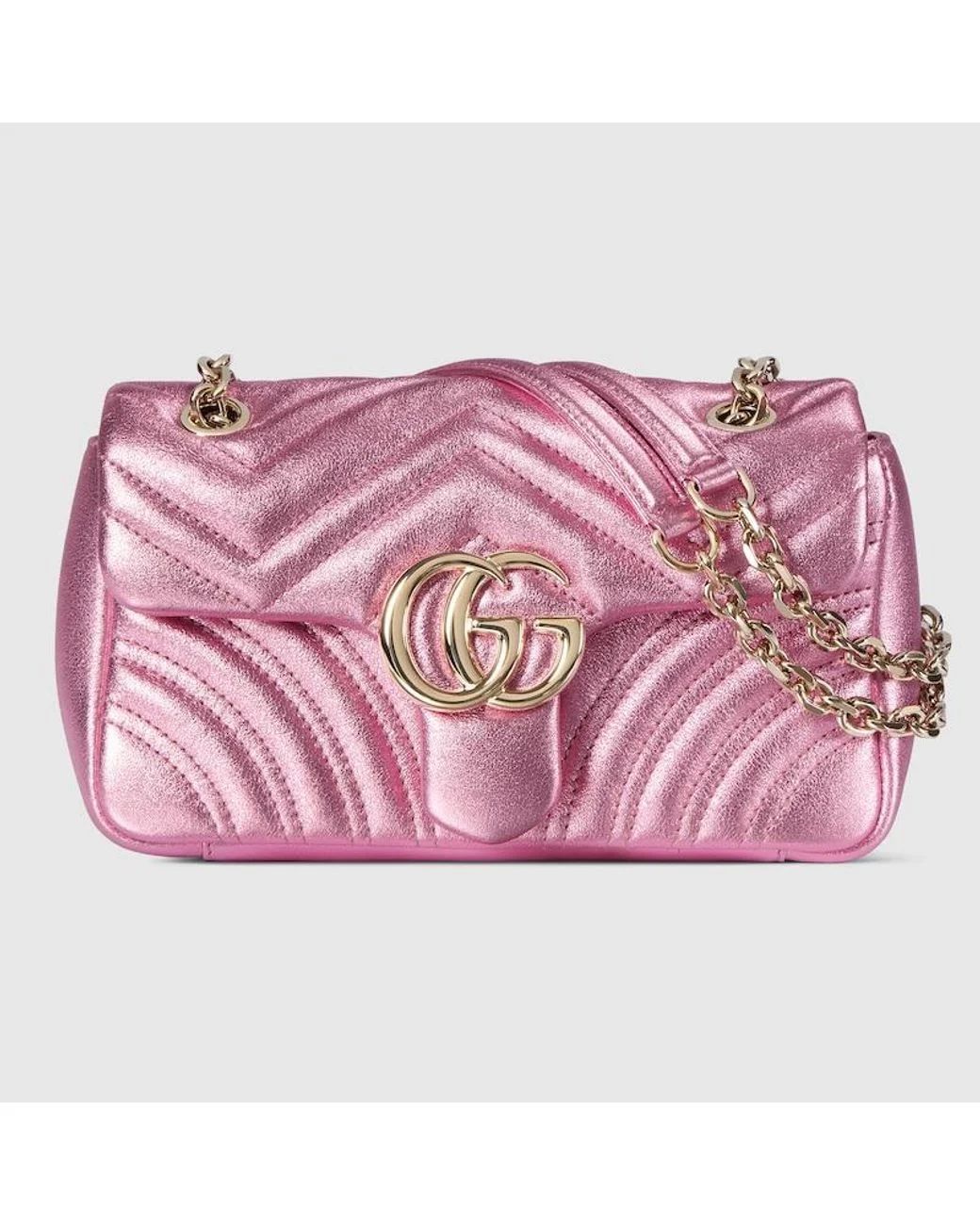 This GG Marmont shoulder bag is crafted from supple matelassé chevron leather, creating the rich textured finish that defines one of Gucci’s most recognizable collections. The softly structured silhouette is paired with the signature Double G hardware, giving the design a polished and timeless appeal that feels both feminine and sophisticated.