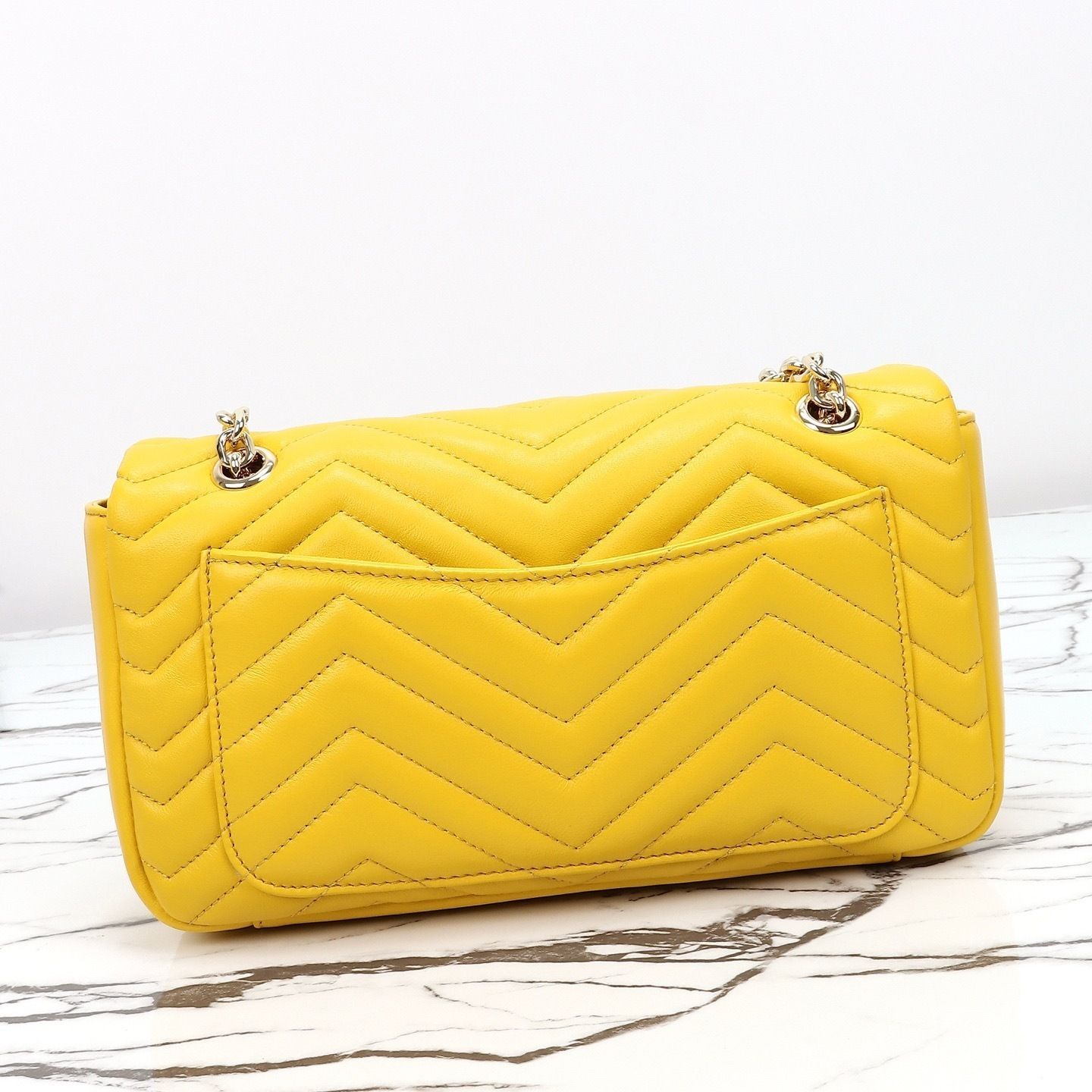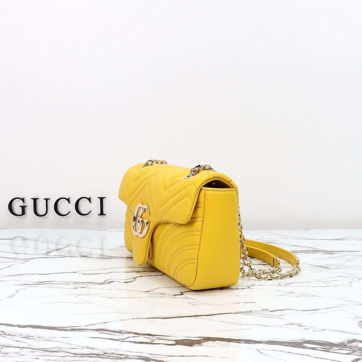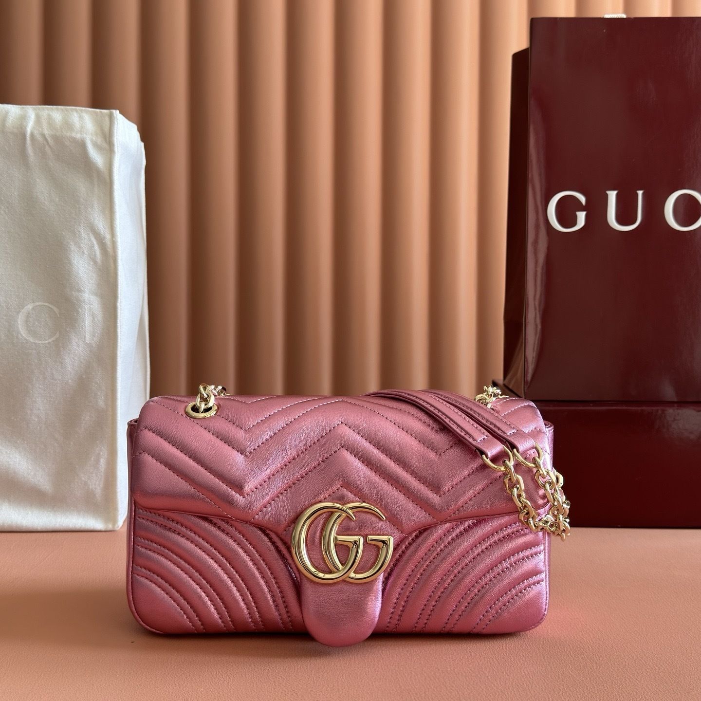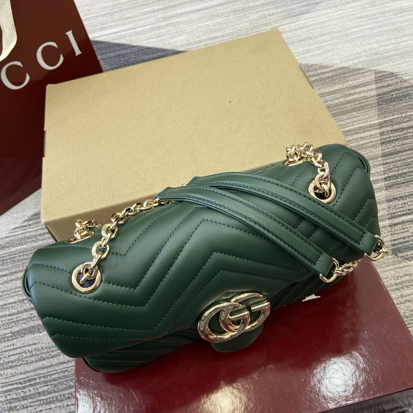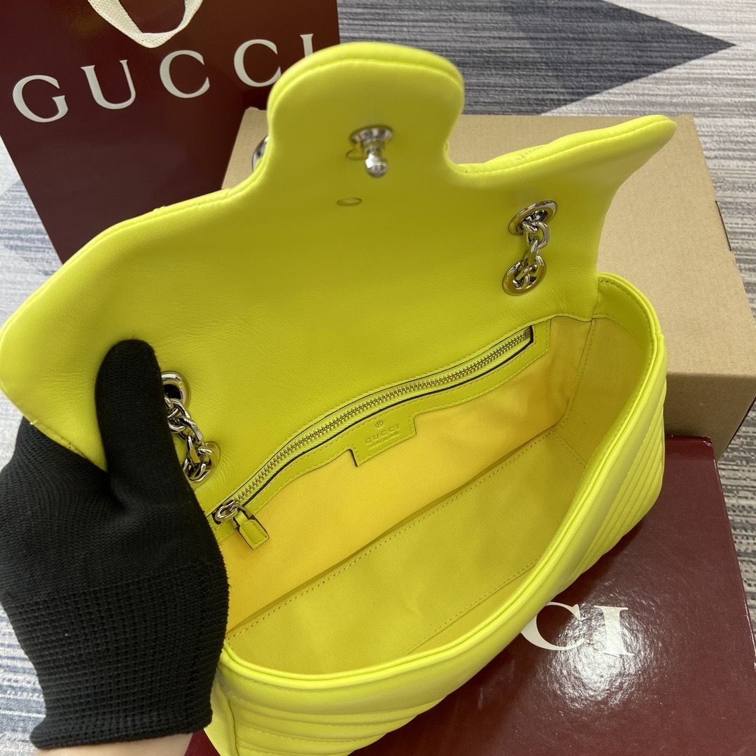 This GG Marmont shoulder bag is crafted from supple matelassé chevron leather, creating the rich textured finish that defines one of Gucci’s most recognizable collections. The softly structured silhouette is paired with the signature Double G hardware, giving the design a polished and timeless appeal that feels both feminine and sophisticated.
