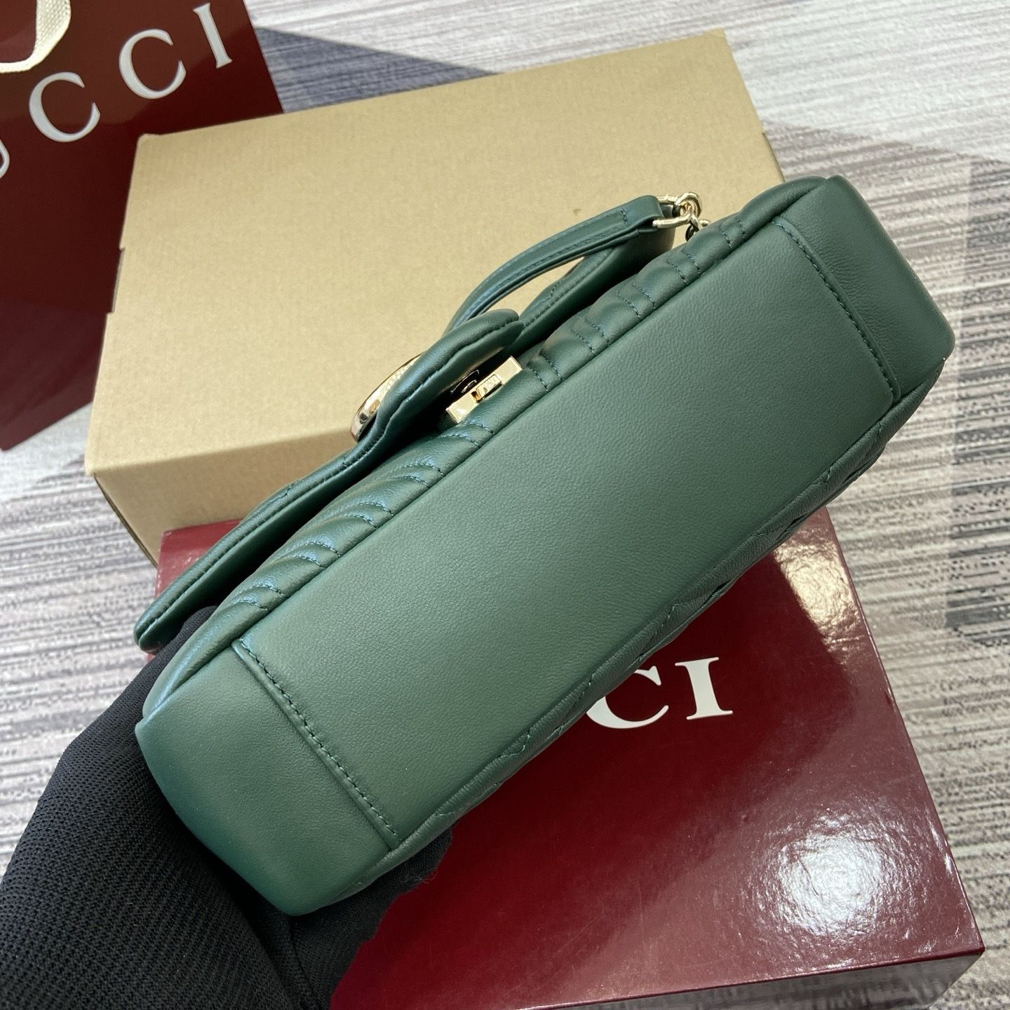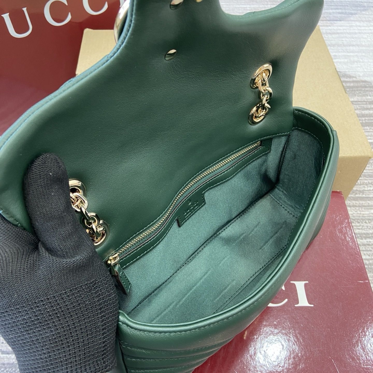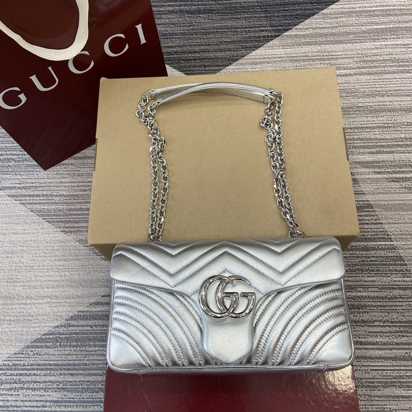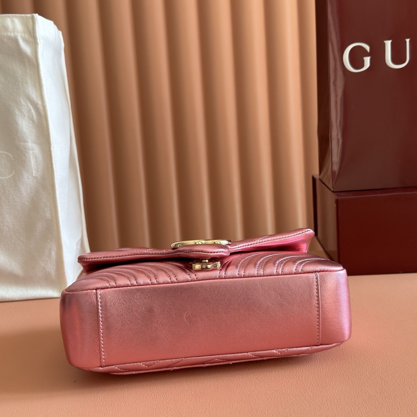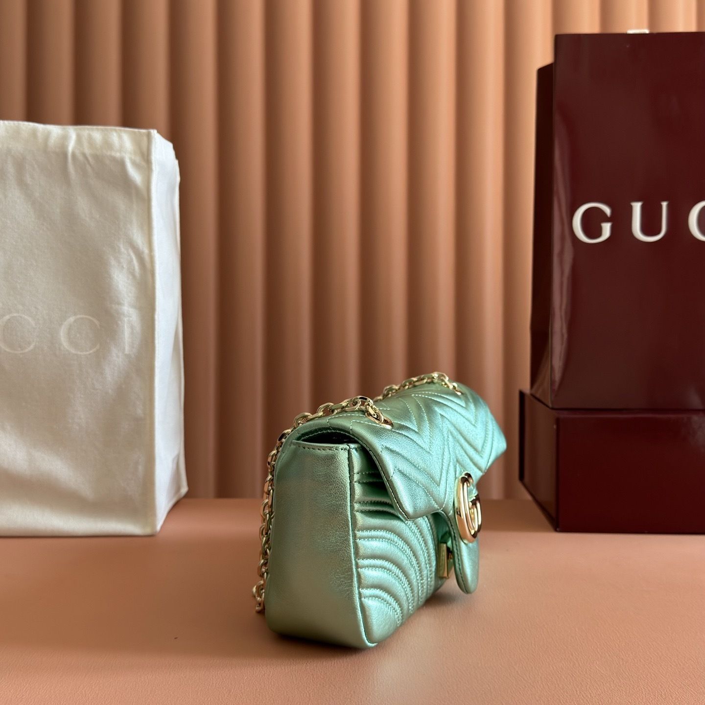 This GG Marmont shoulder bag is crafted from supple matelassé chevron leather, creating the rich textured finish that defines one of Gucci’s most recognizable collections. The softly structured silhouette is paired with the signature Double G hardware, giving the design a polished and timeless appeal that feels both feminine and sophisticated.