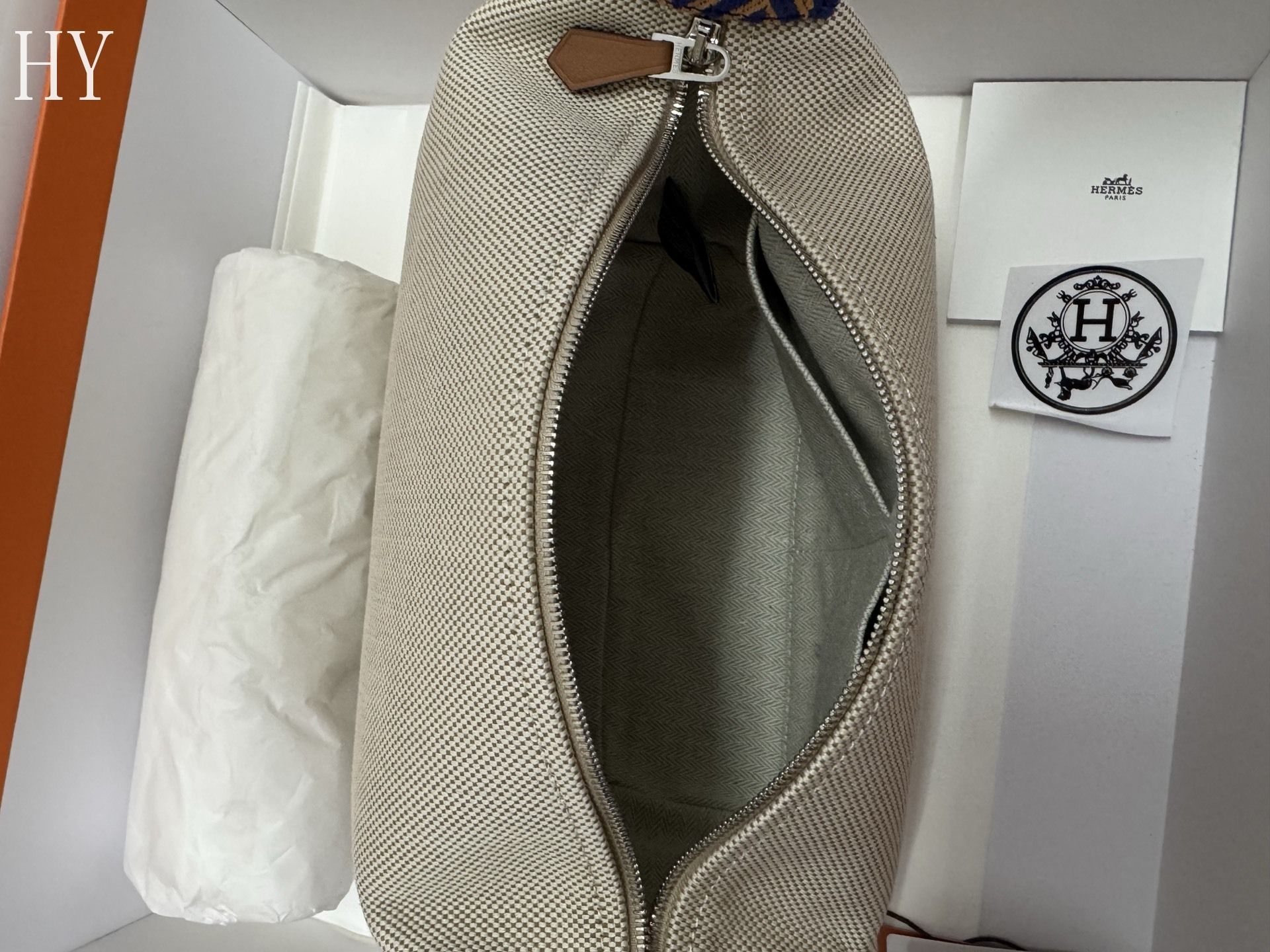 Designed for practical luxury, this large case features a herringbone cotton lining, three interior pockets, and a versatile hanging handle that closes in multiple ways for convenience on the go. Its spacious proportions make it perfect for storing toiletries, beauty essentials, or travel accessories, while the refined canvas finish keeps the look timeless, functional, and effortlessly sophisticated.