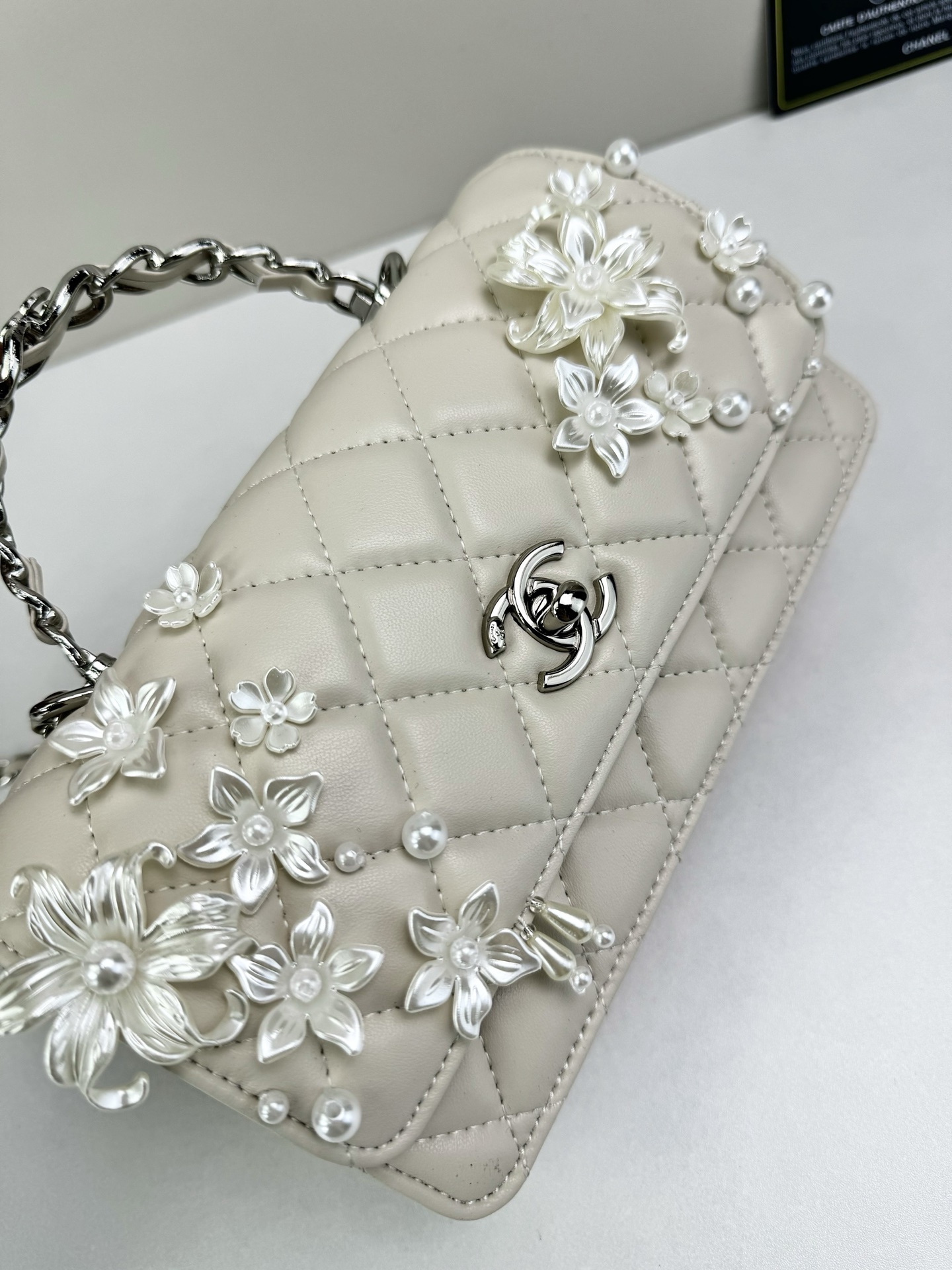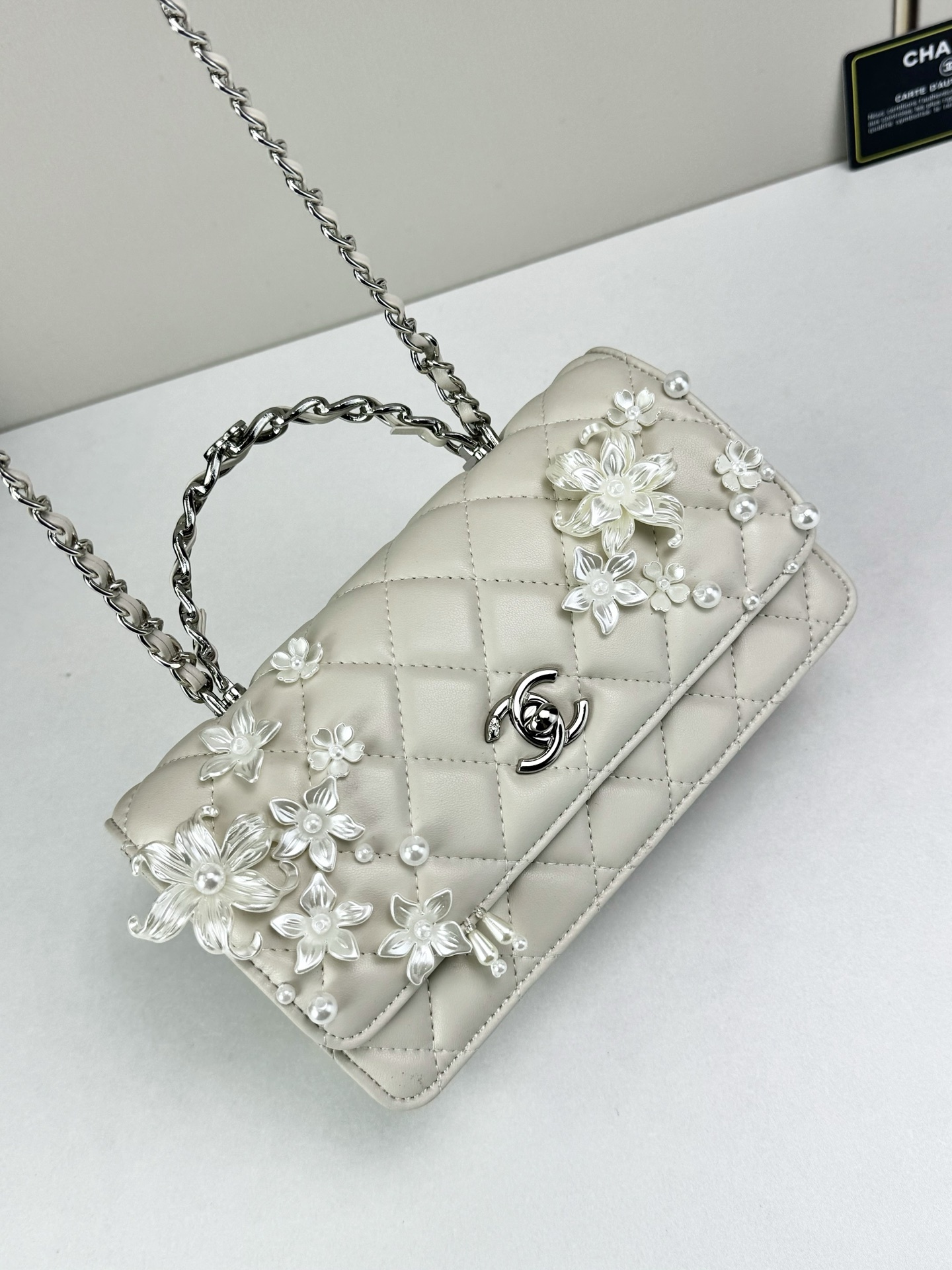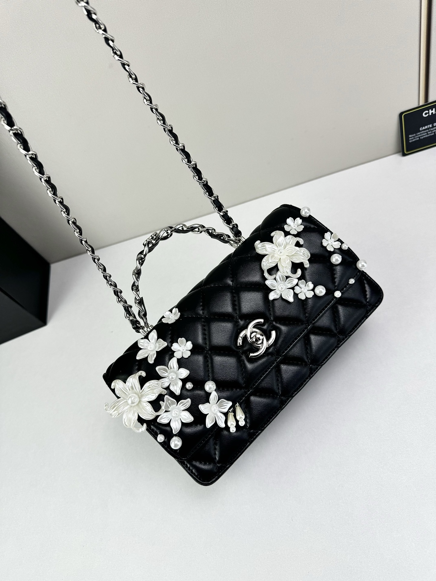 This sophisticated handbag features classic diamond-quilted leather, elevated by intricate floral appliqué detailing and signature CC turn-lock hardware for a look that feels romantic, elegant, and unmistakably refined. The structured flap silhouette is complemented by a top handle and chain strap, blending timeless Chanel-inspired codes with graceful decorative artistry.
