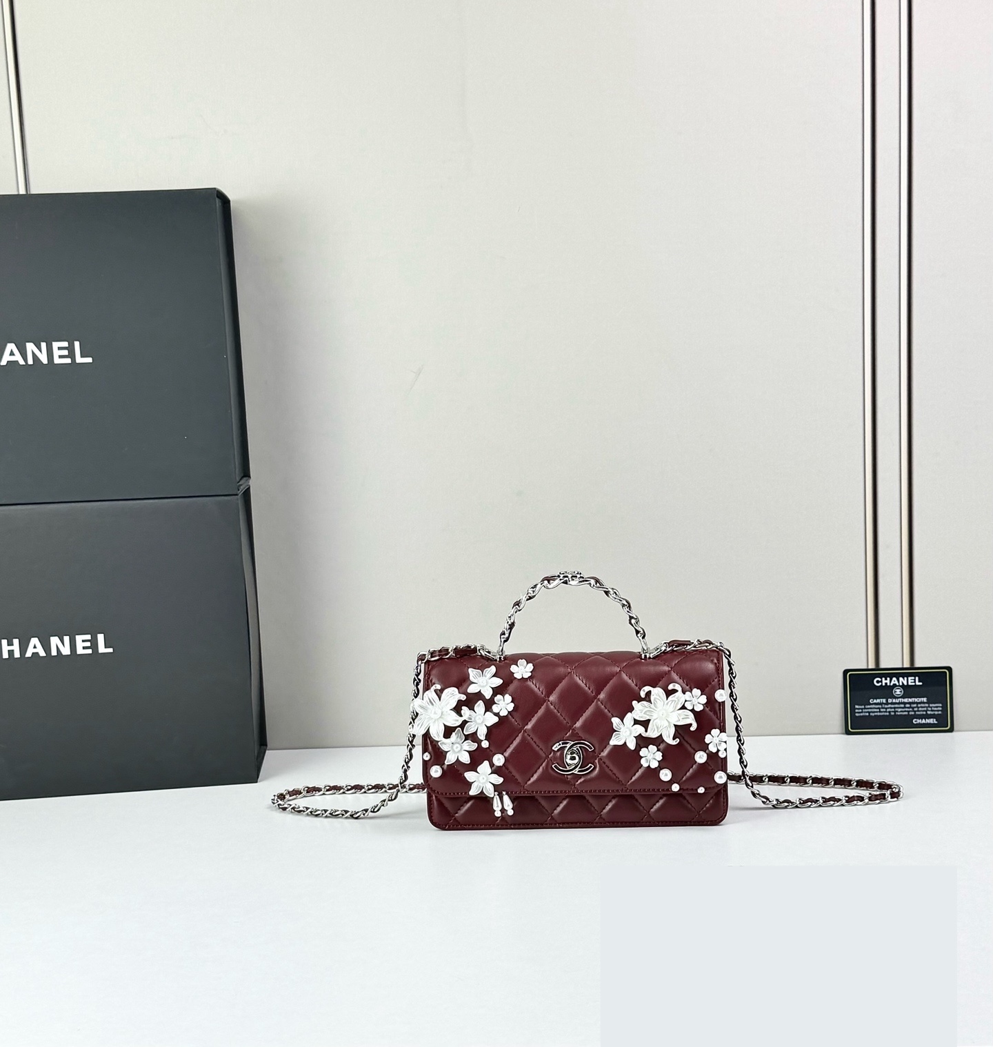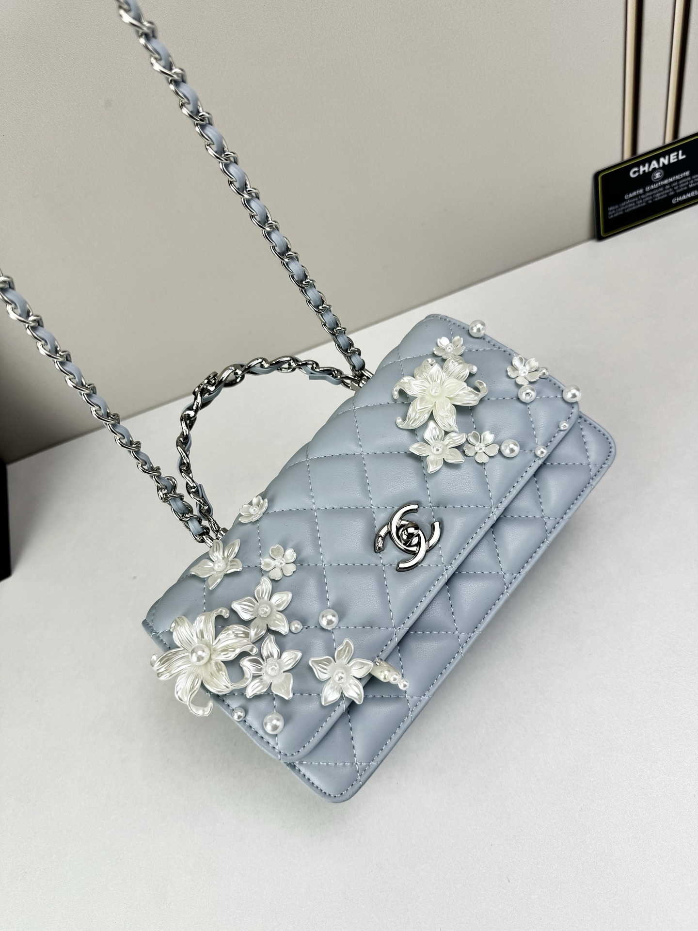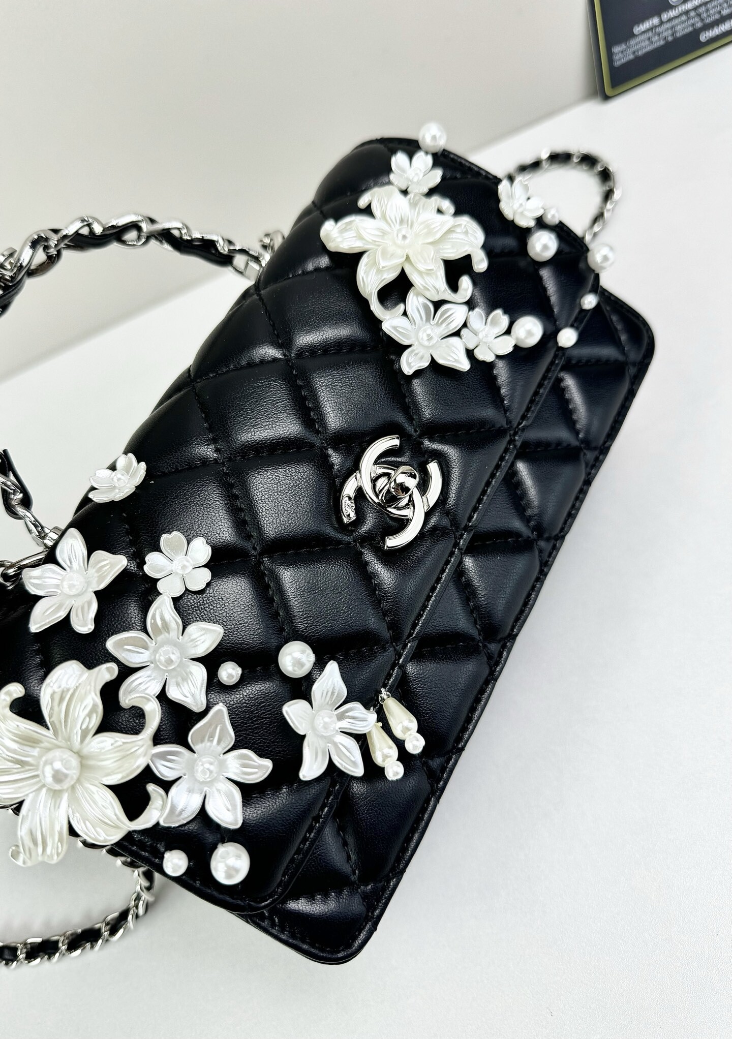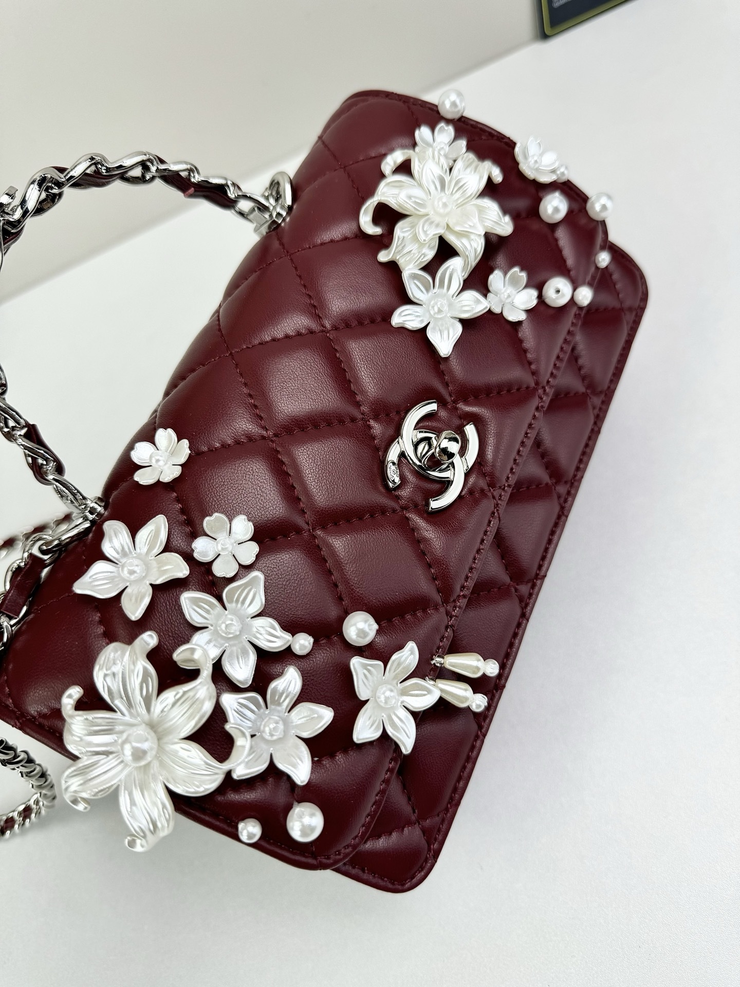 This sophisticated handbag features classic diamond-quilted leather, elevated by intricate floral appliqué detailing and signature CC turn-lock hardware for a look that feels romantic, elegant, and unmistakably refined. The structured flap silhouette is complemented by a top handle and chain strap, blending timeless Chanel-inspired codes with graceful decorative artistry.