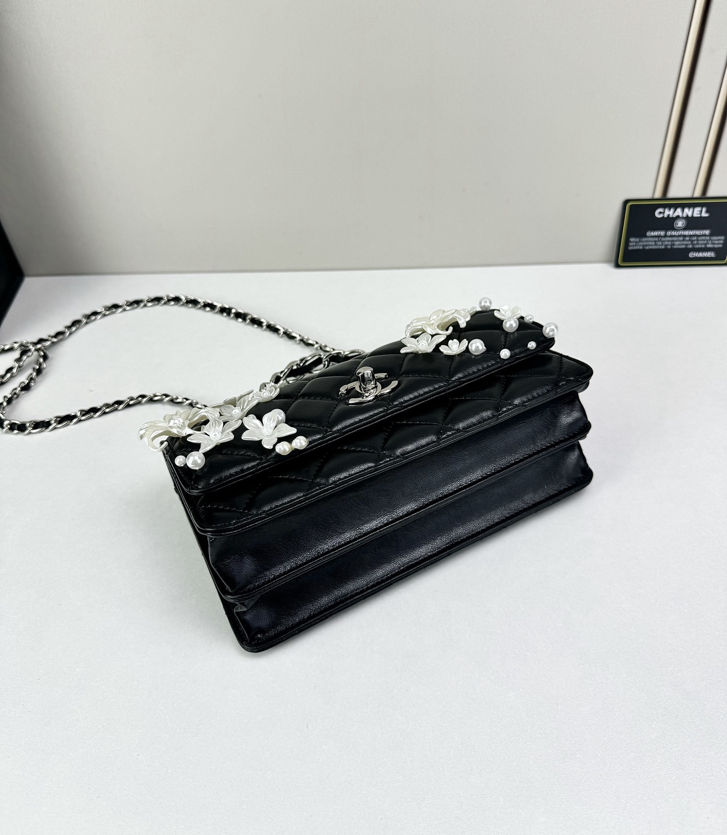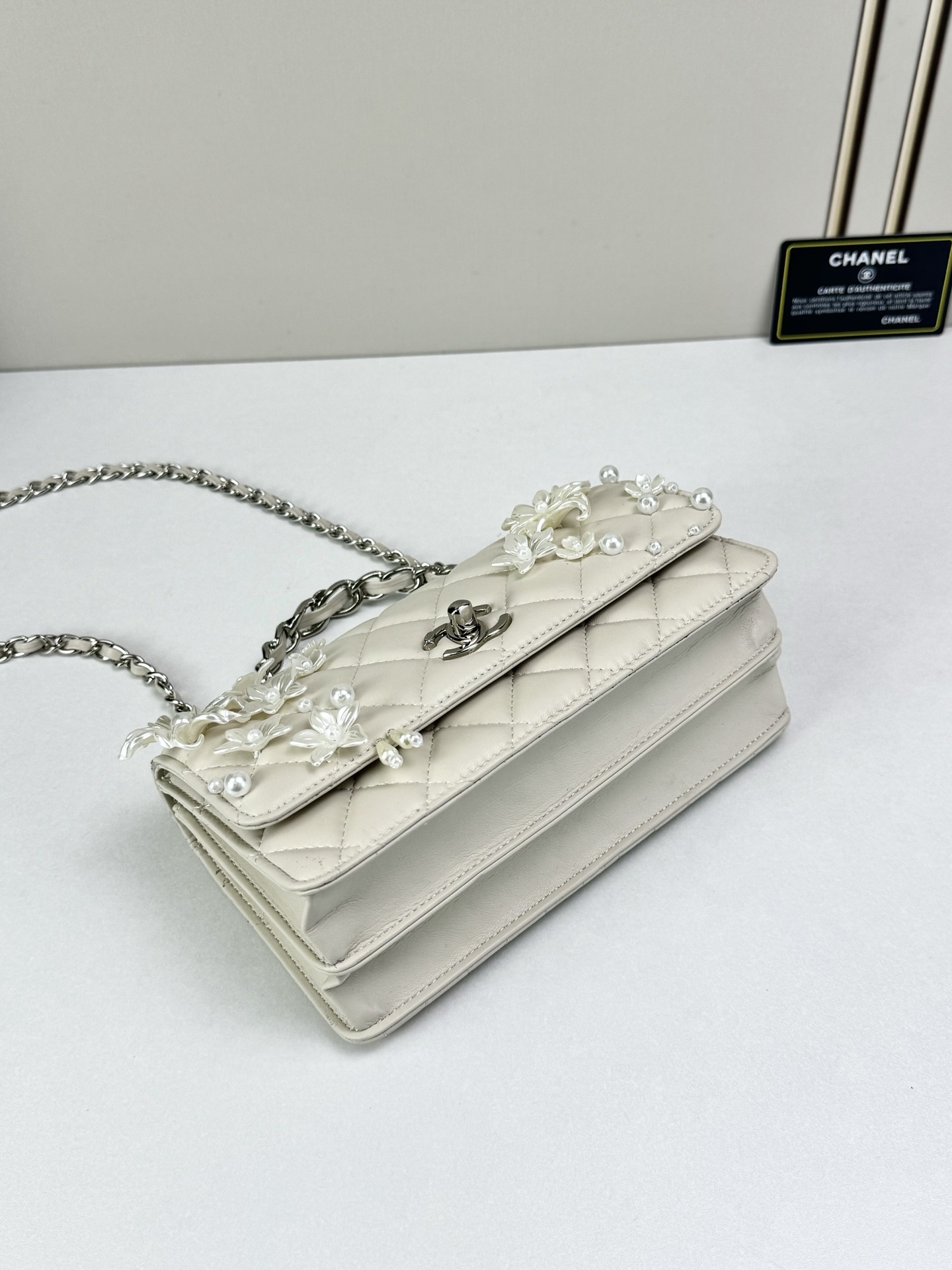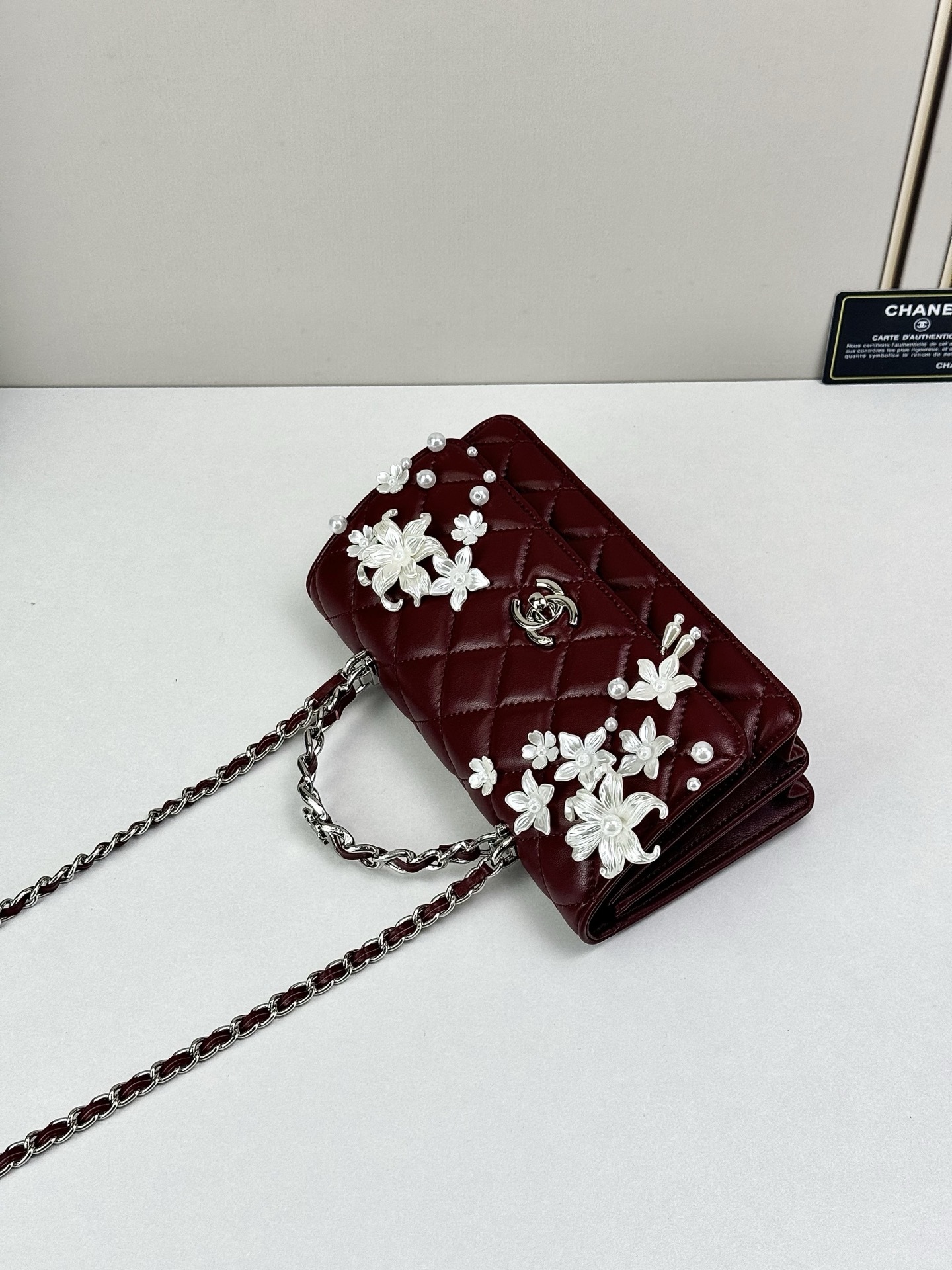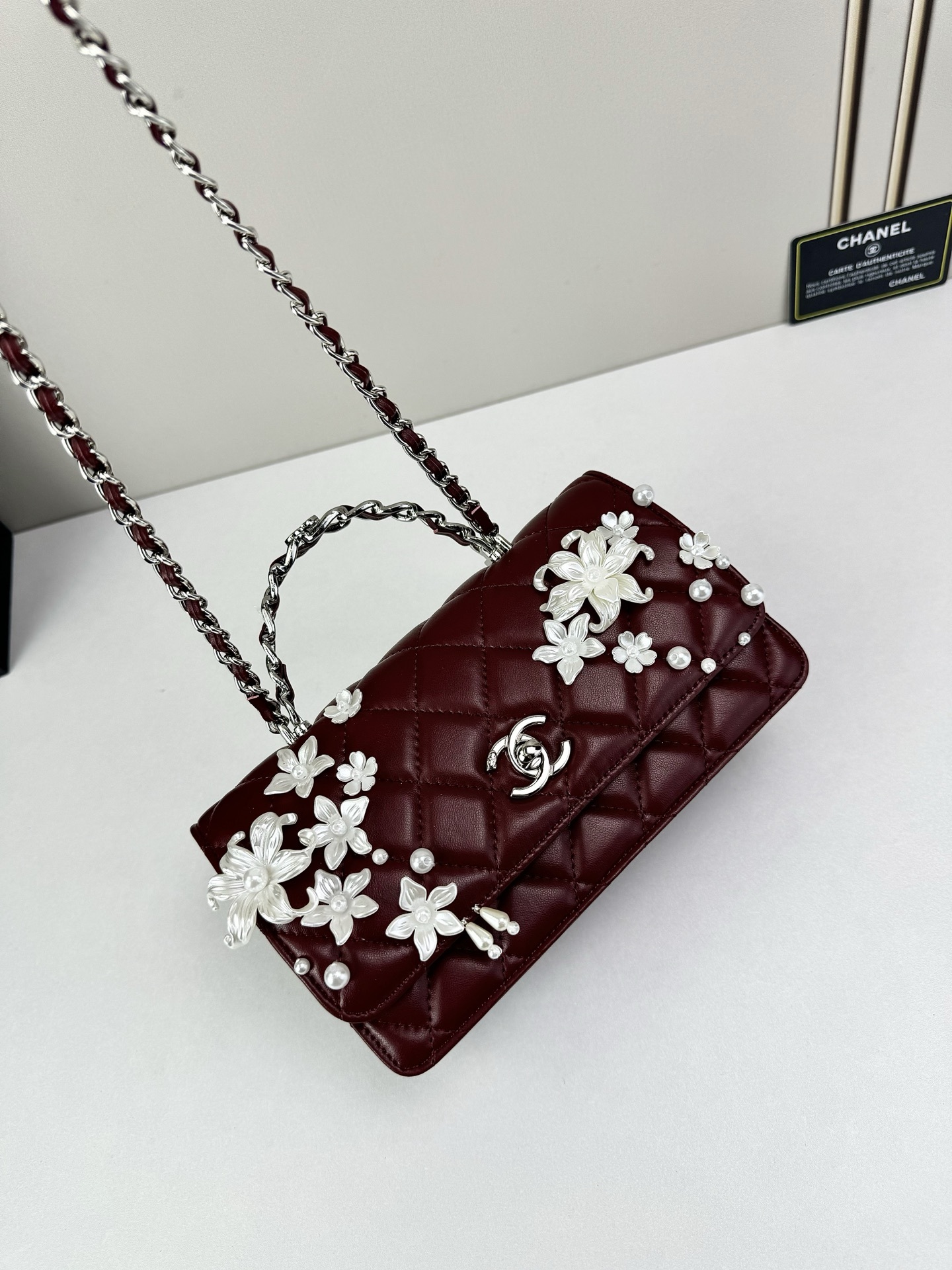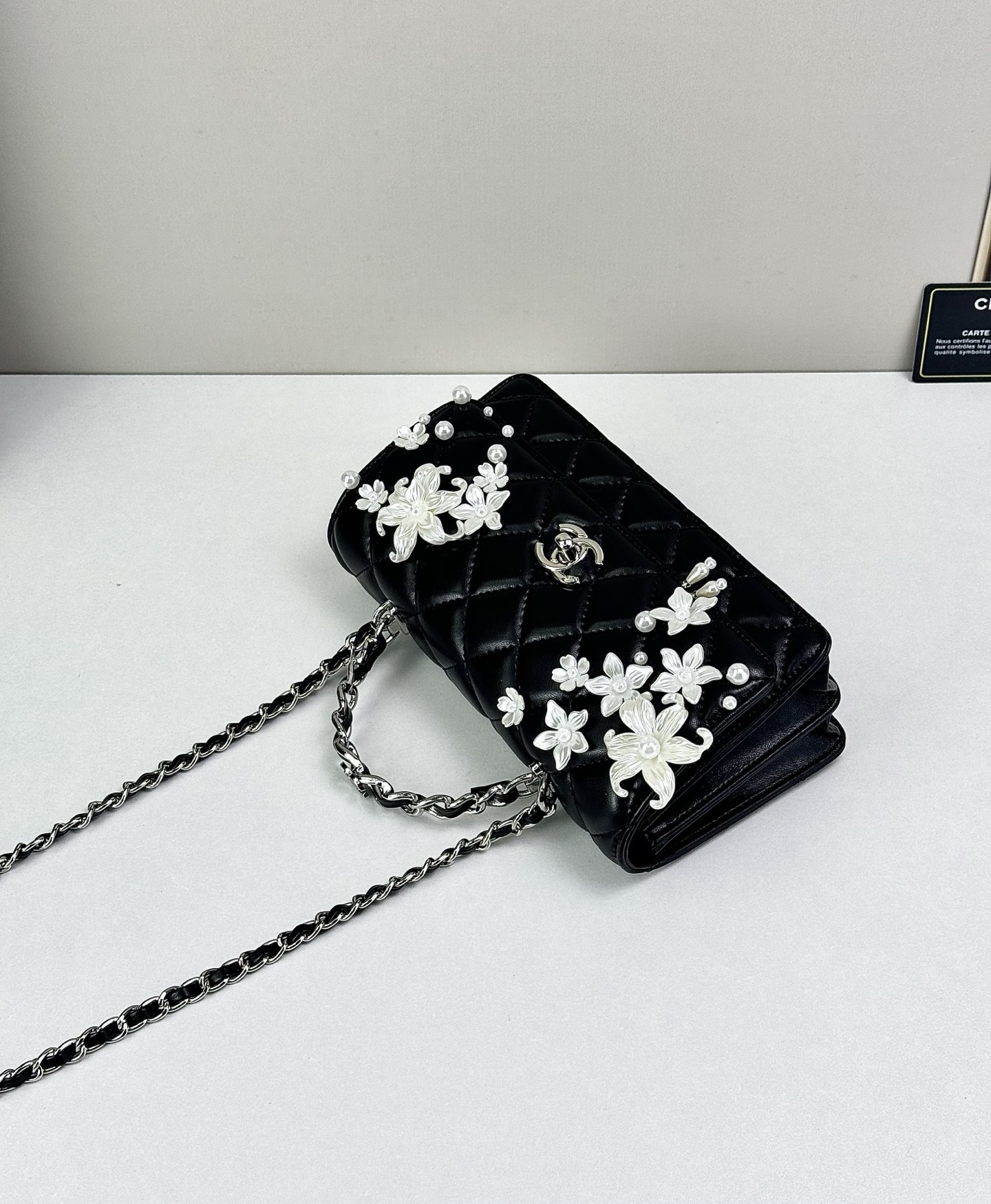 - Detail: Signature CC turn-lock and decorative floral accents