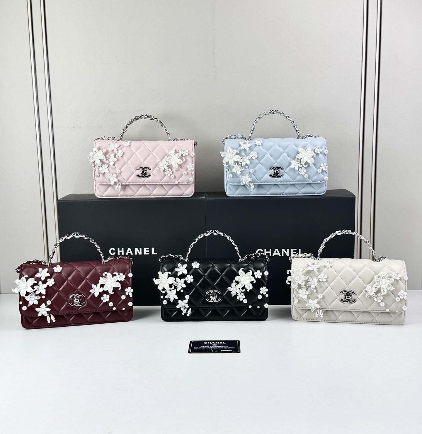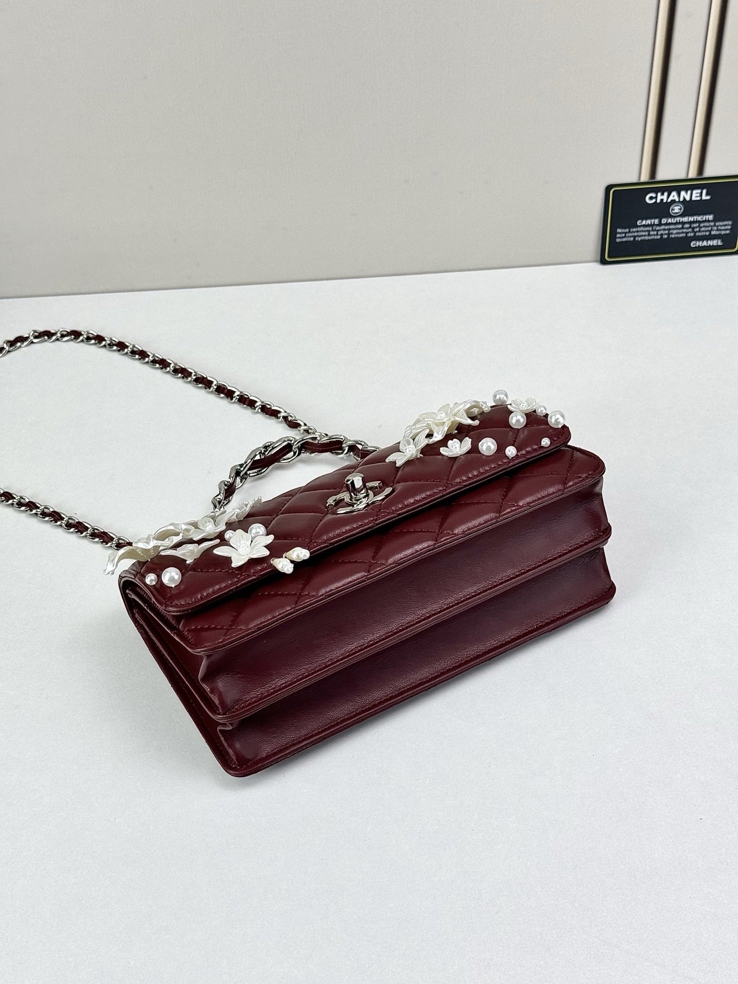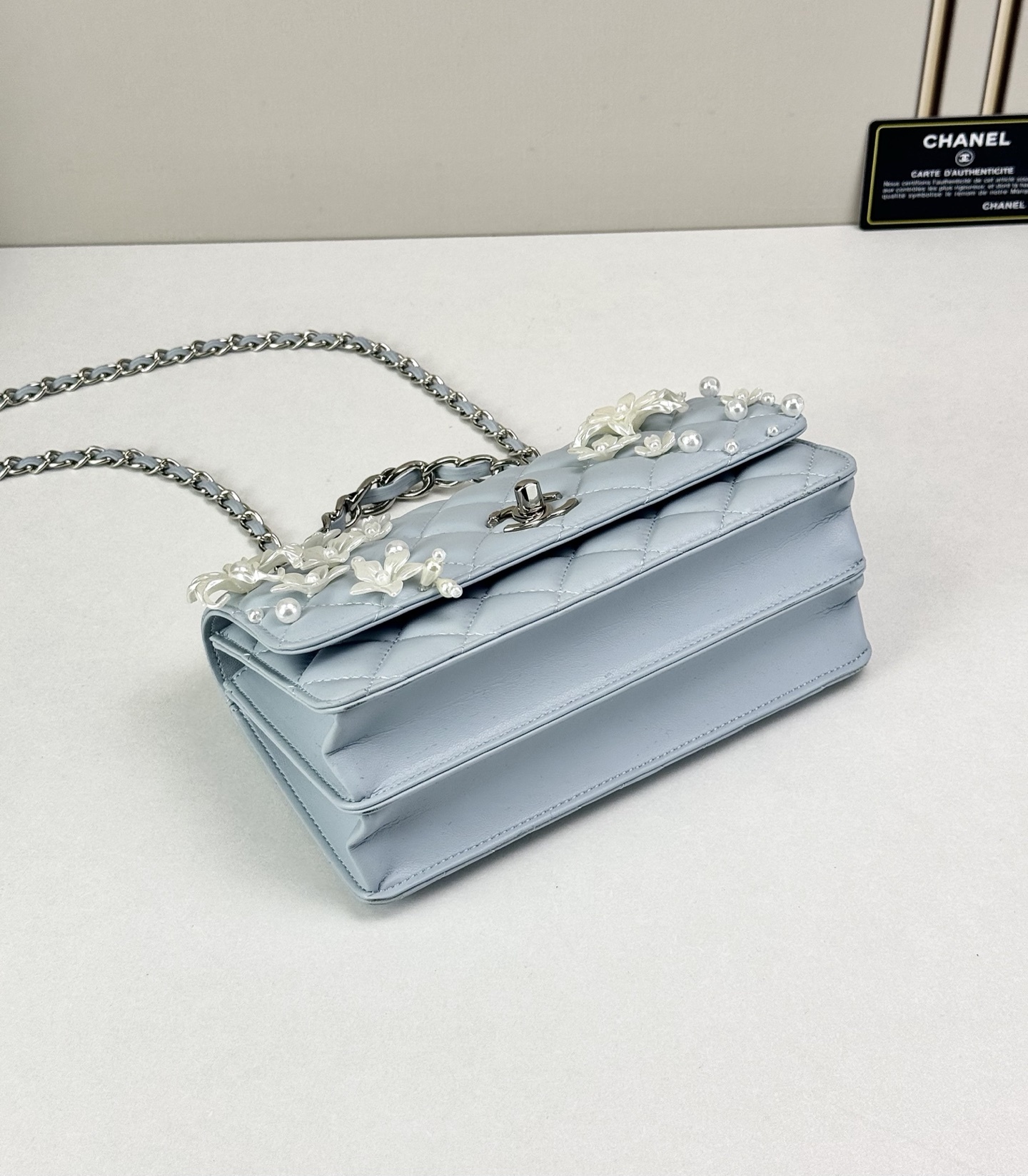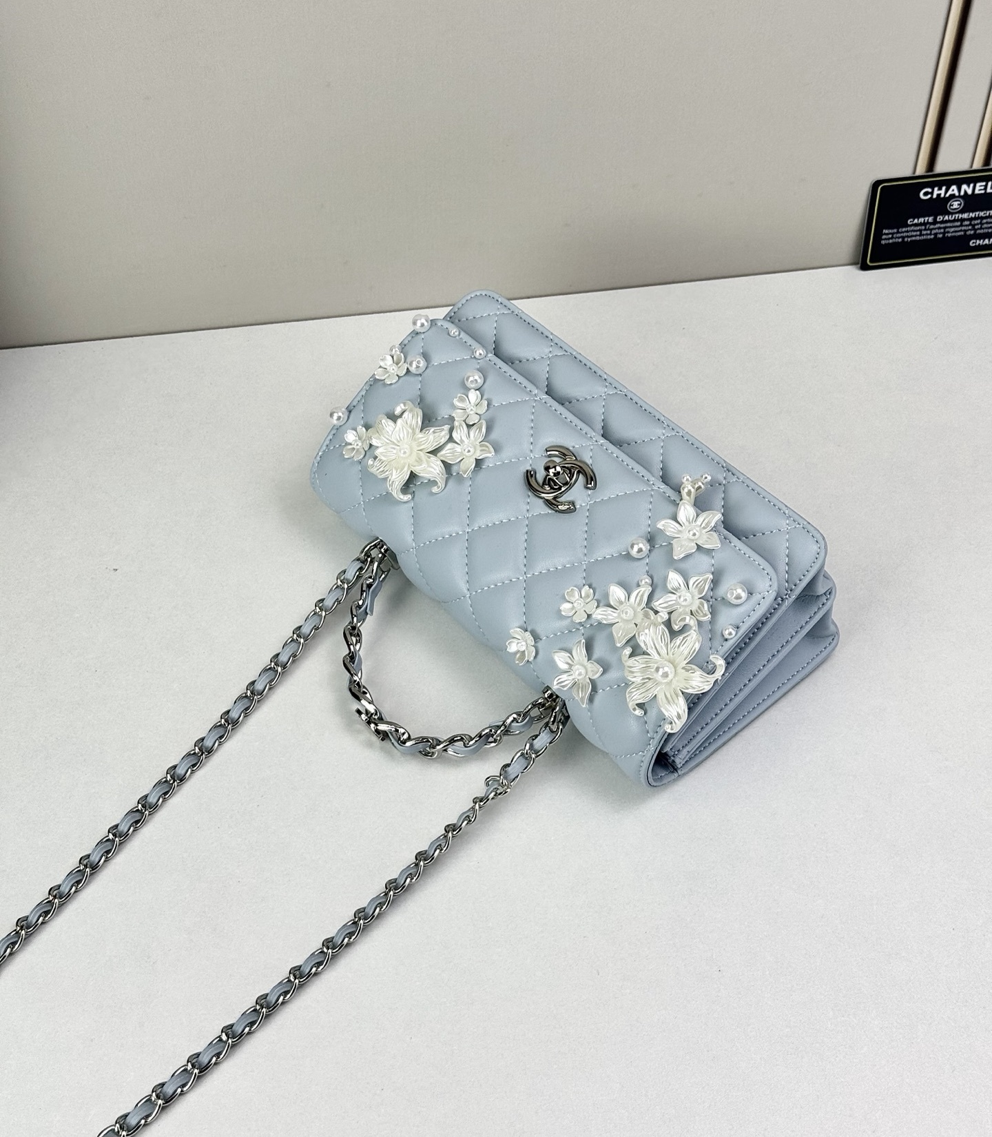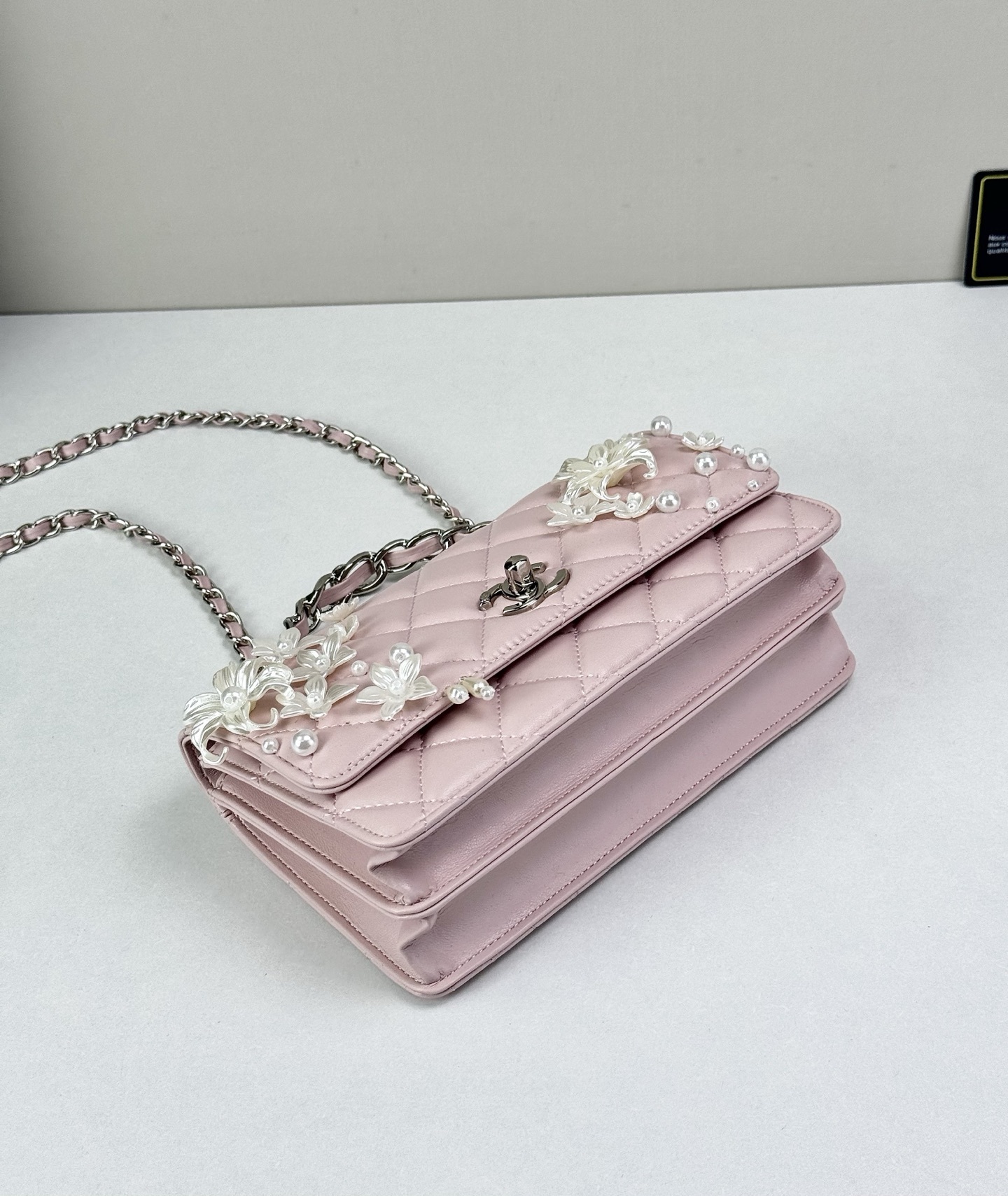 - Detail: Signature CC turn-lock and decorative floral accents