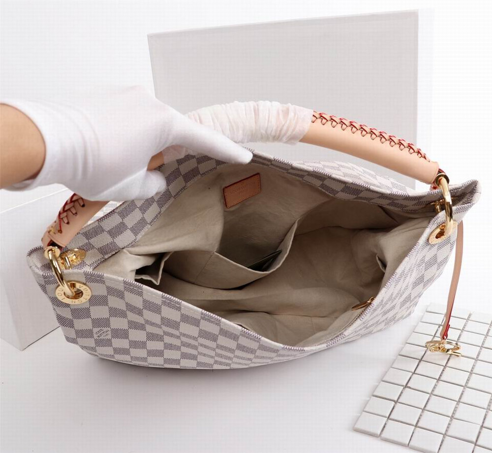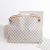 The LV Artsy MM showcases the iconic Damier Azur canvas in a soft, airy beige palette, creating a fresh and feminine aesthetic.