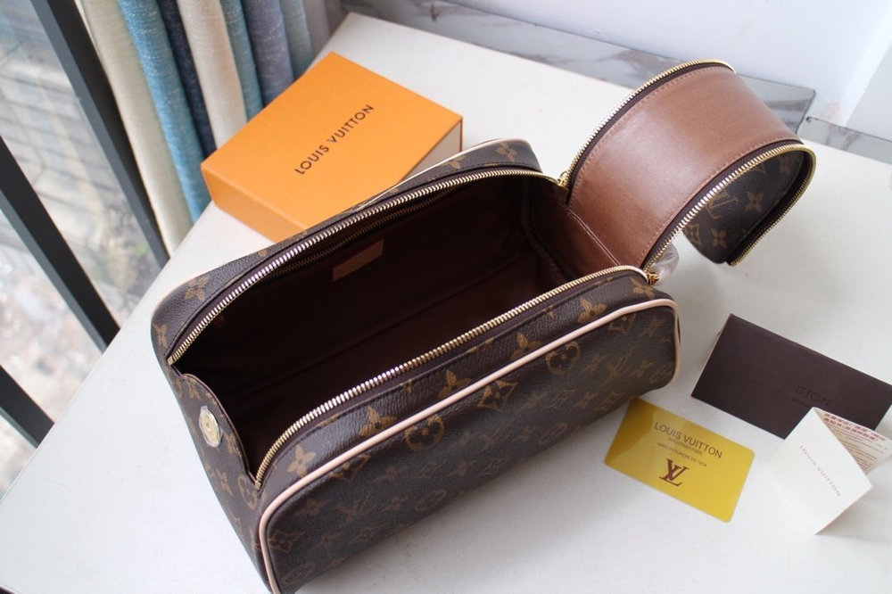 Designed with convenience in mind, this toiletry bag features a sturdy side handle for easy carrying. The classic brown Monogram finish enhances its sophisticated look.