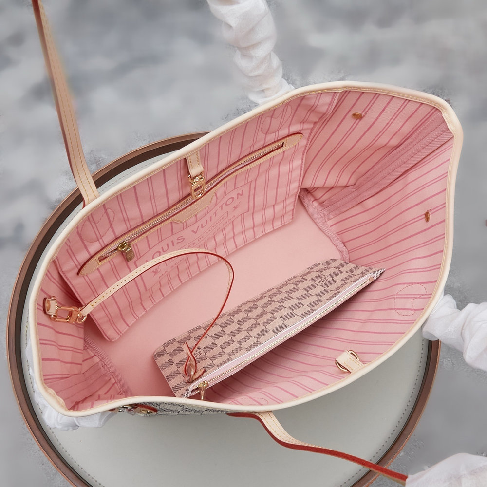 Elegant, spacious, and effortlessly feminine— the LV Neverfull GM Damier Azur Canvas Rose Ballerine Pink for Women N41604 is designed to keep up with your lifestyle while elevating your everyday look.