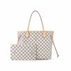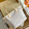 The LV Neverfull MM Tote Bag features the iconic Damier Azur canvas, showcasing a soft beige checkered pattern that brings a clean and refreshing aesthetic. Its timeless design makes it easy to pair with both casual and sophisticated outfits.