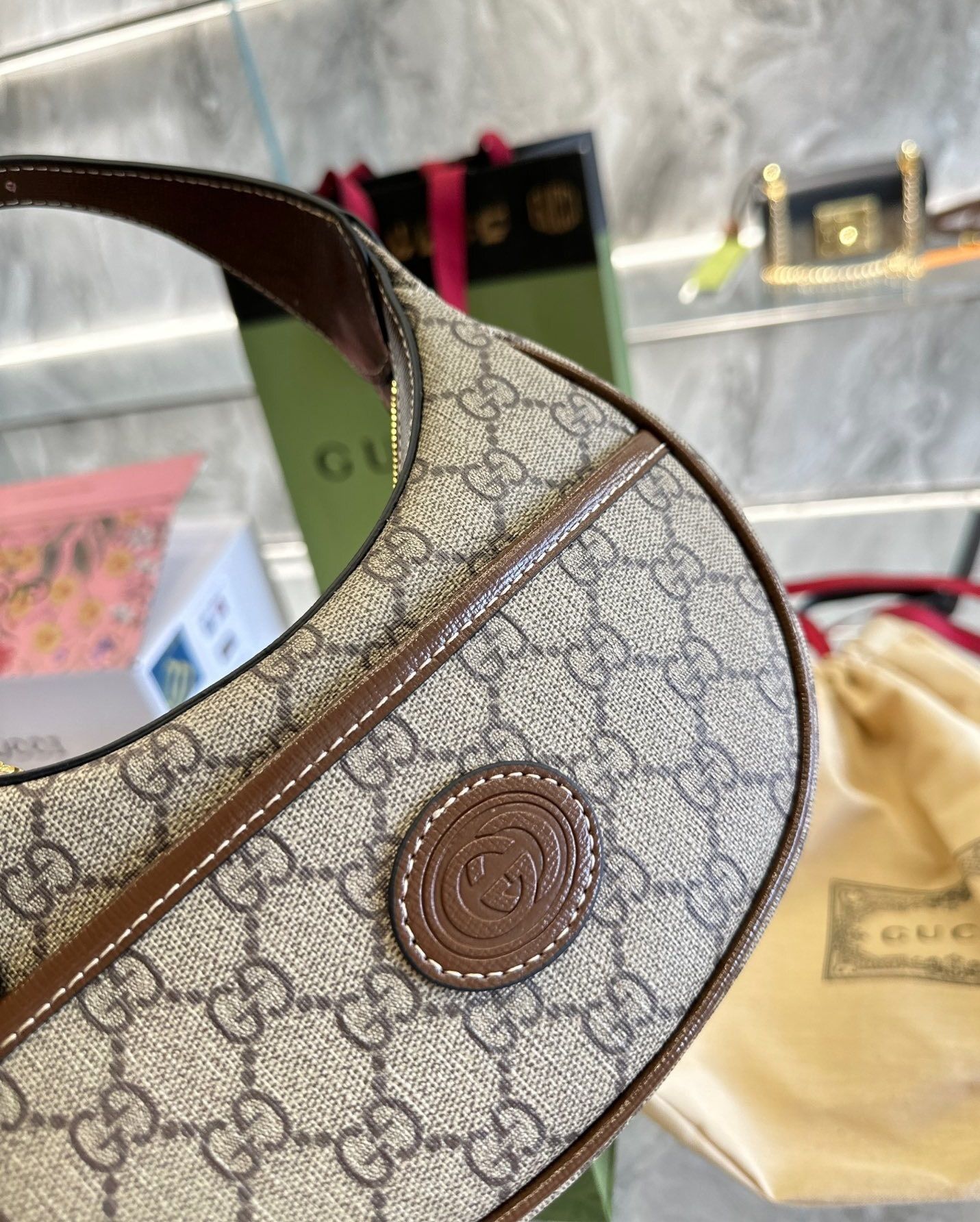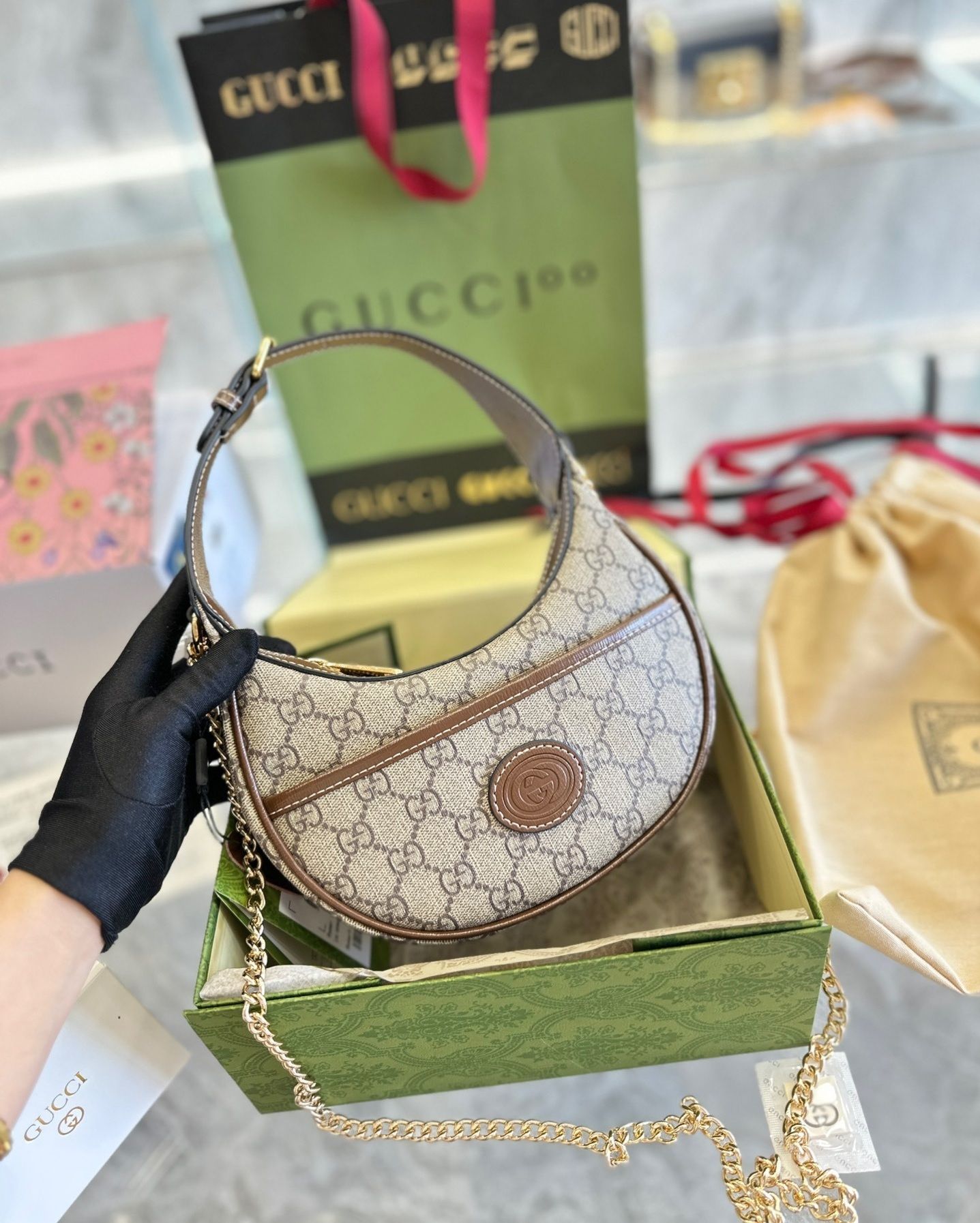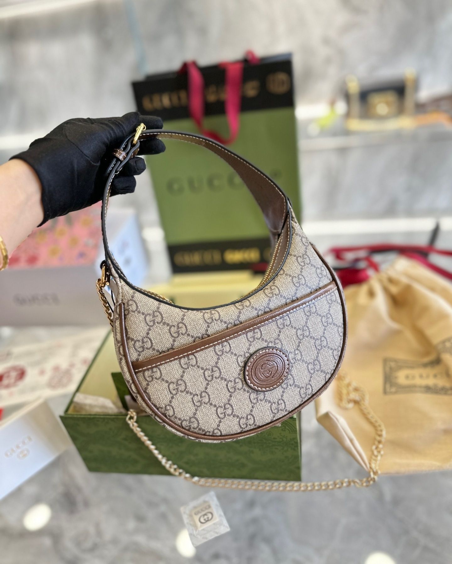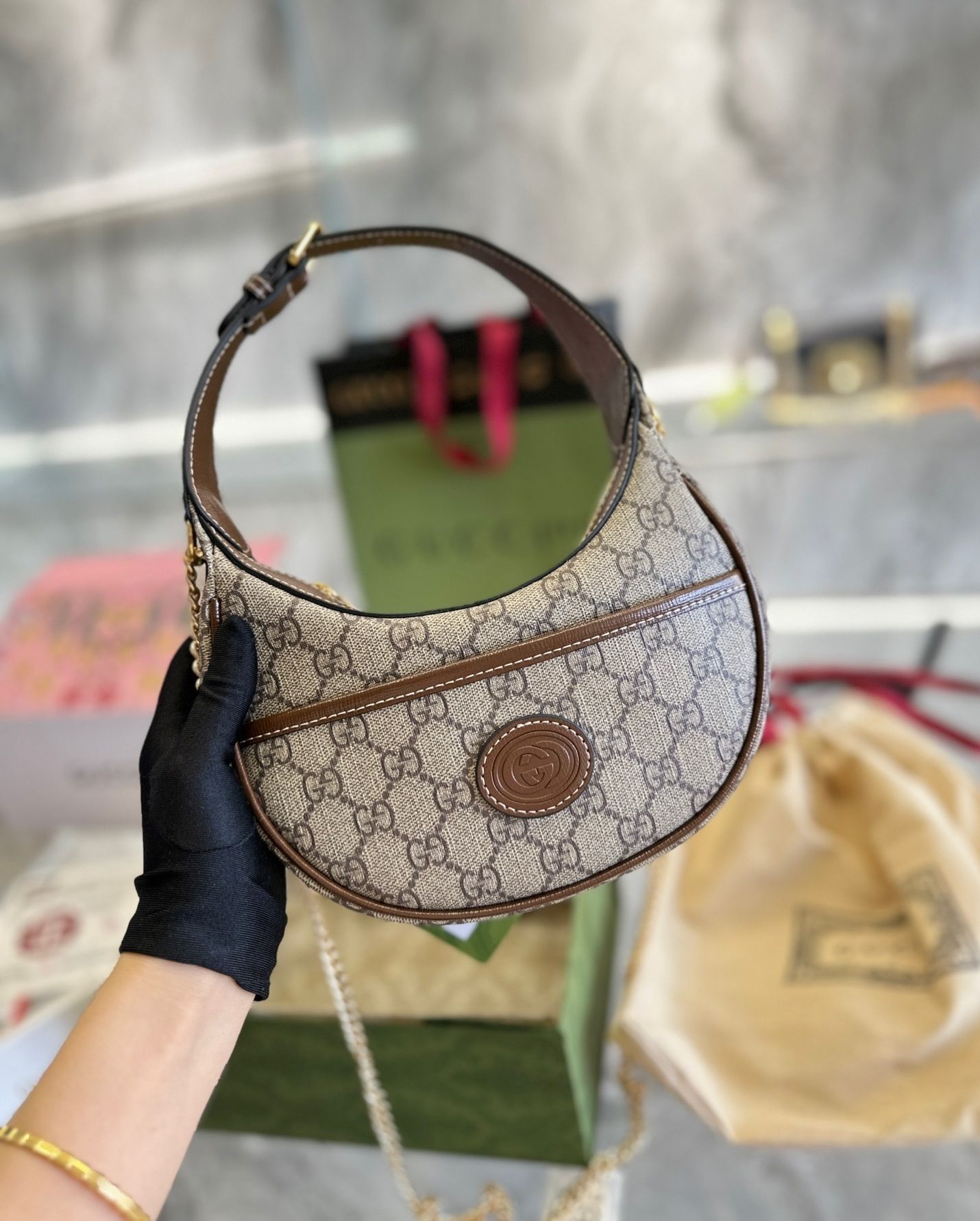 The GG Half-Moon-Shaped Mini Bag features a distinctive curved design inspired by contemporary fashion trends while maintaining classic luxury elements. Crafted from premium materials with refined leather trim, the bag delivers a sleek and polished aesthetic.