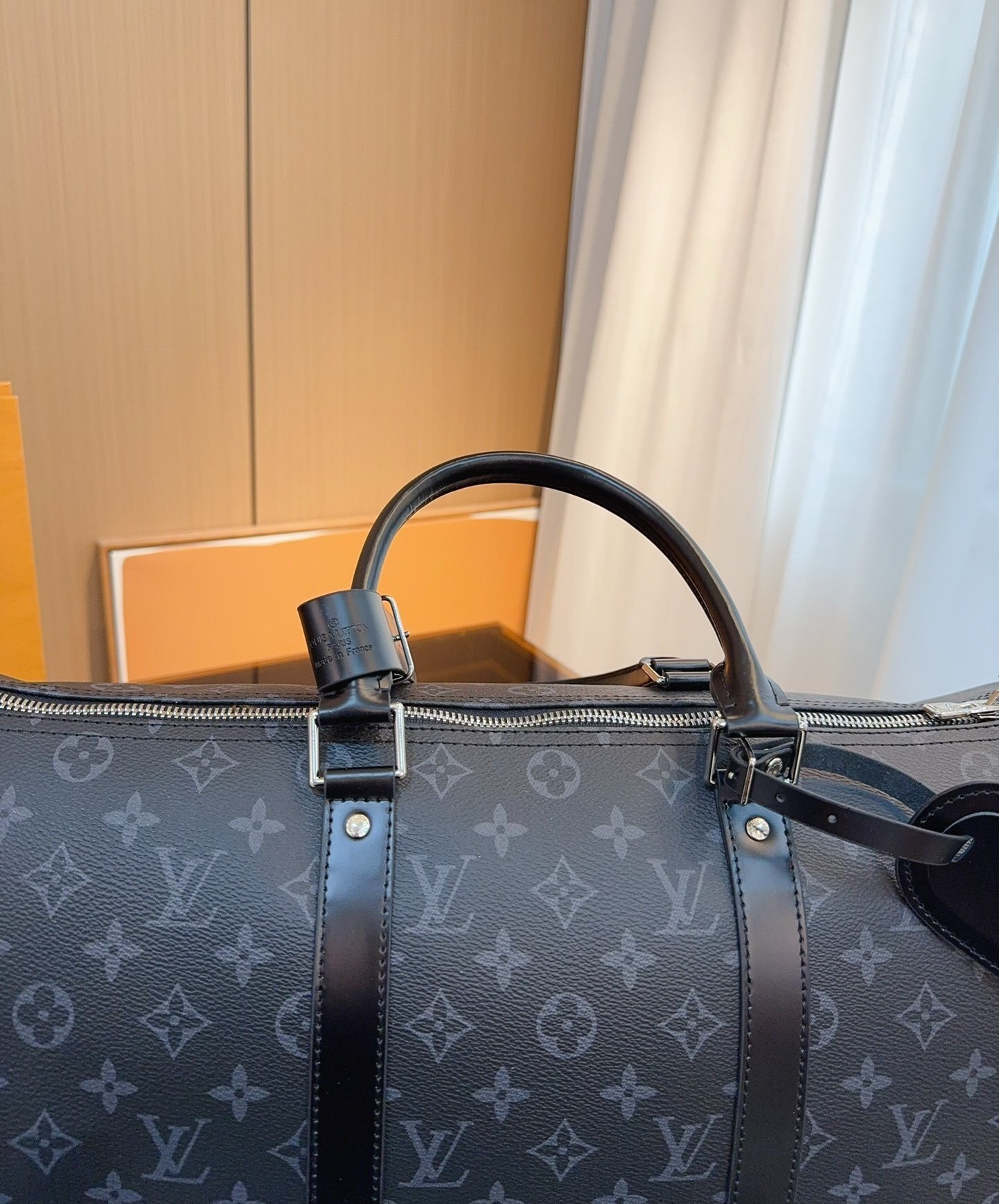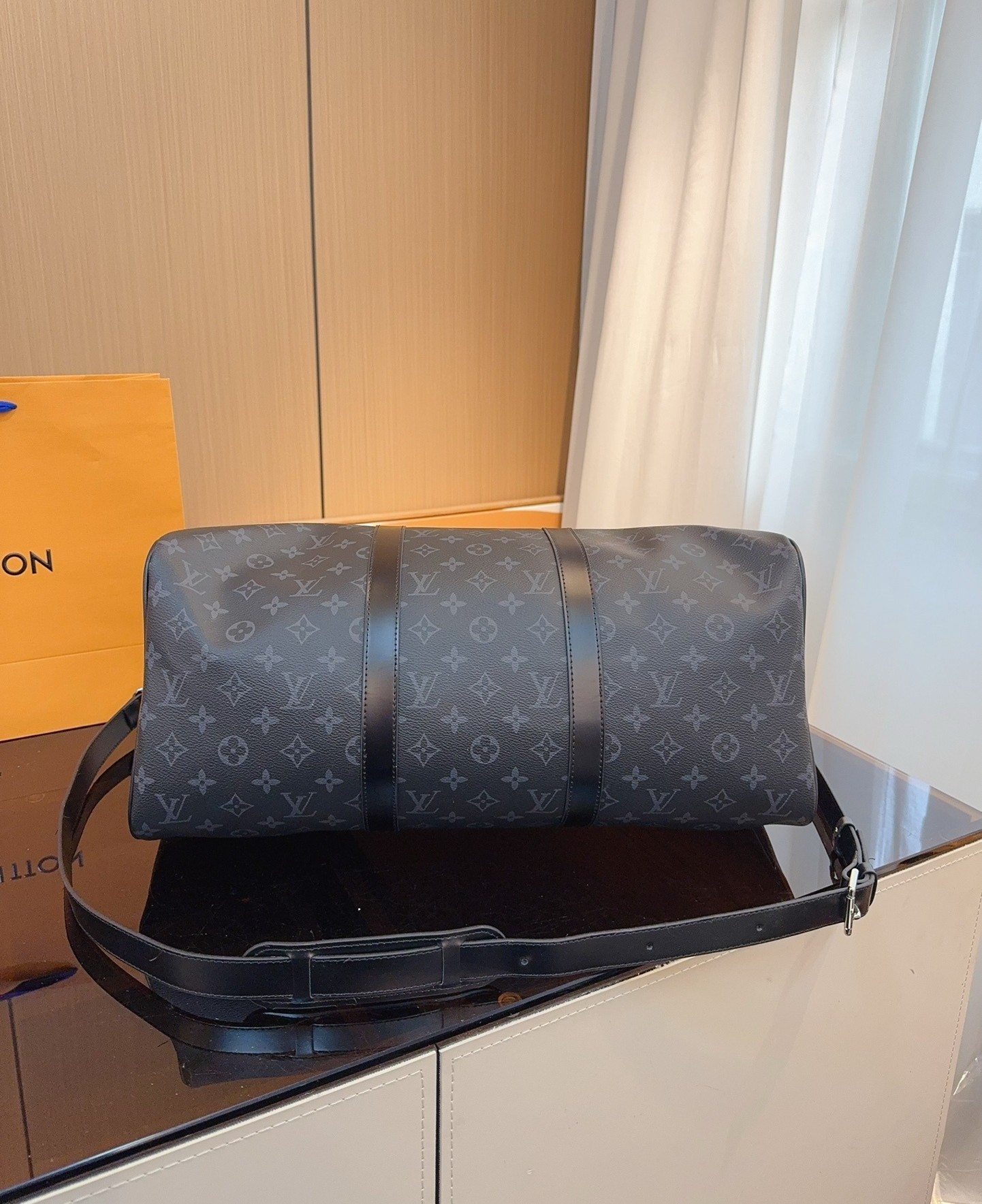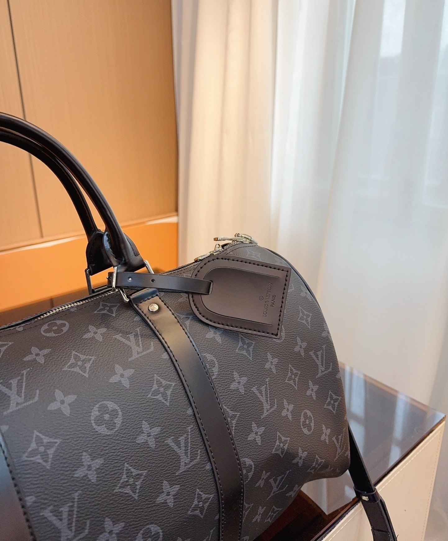 The LV Keepall Bandoulière LV662 is crafted from the distinctive Monogram Eclipse canvas, a modern interpretation of the classic Louis Vuitton monogram featuring a refined black palette.