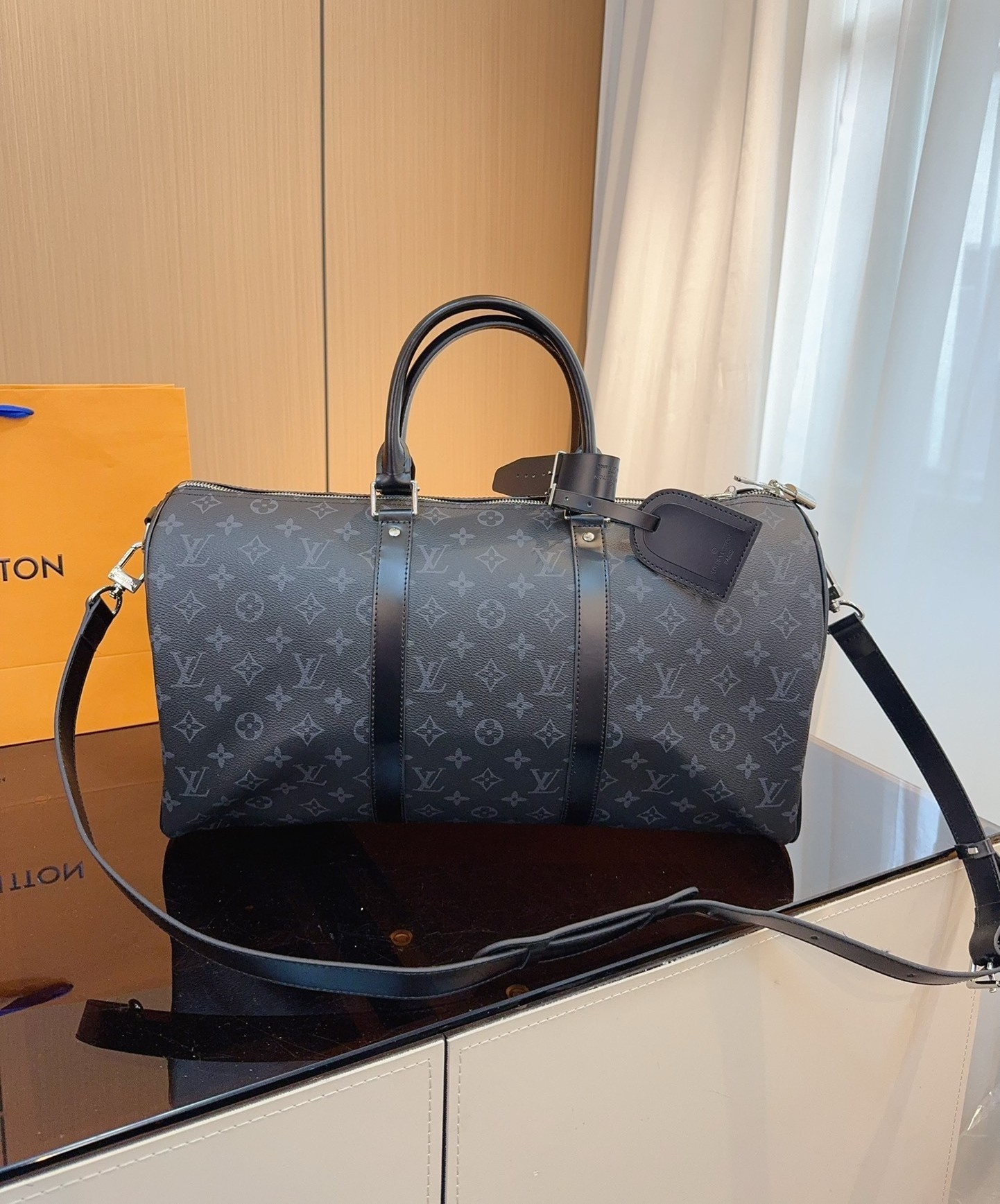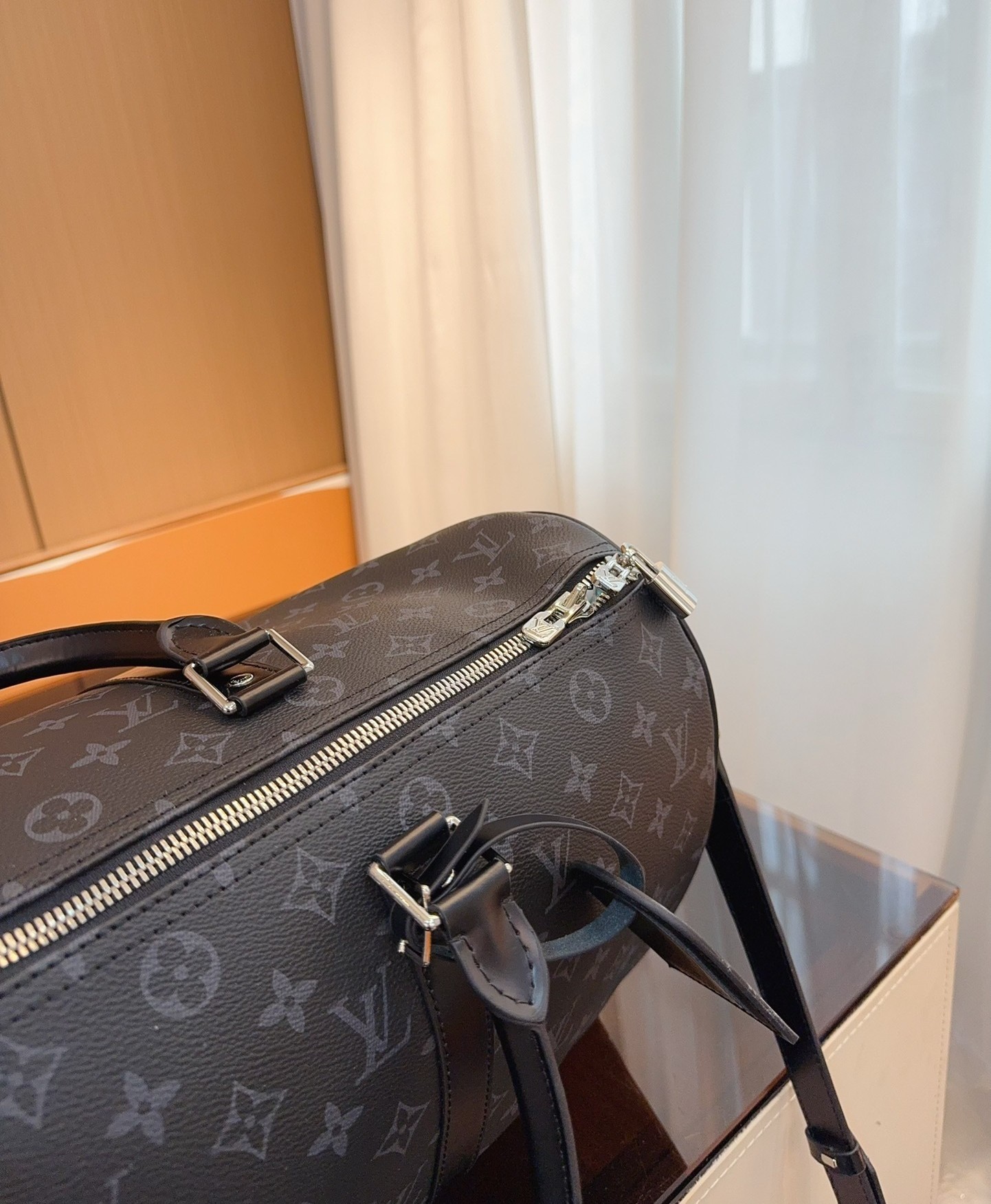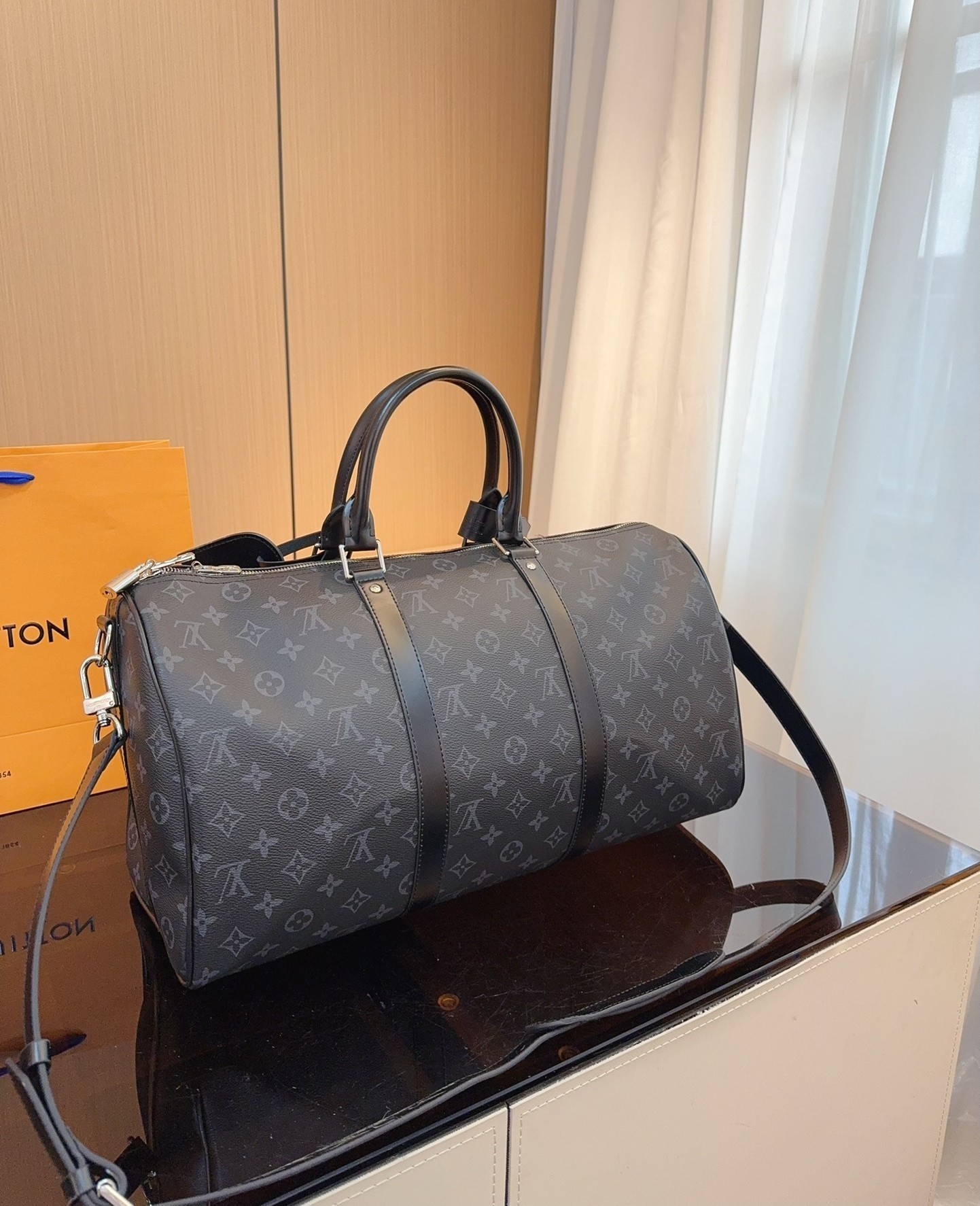 The LV Keepall Bandoulière LV662 is crafted from the distinctive Monogram Eclipse canvas, a modern interpretation of the classic Louis Vuitton monogram featuring a refined black palette.