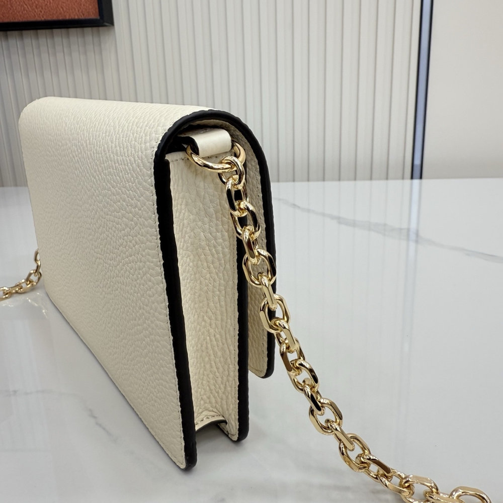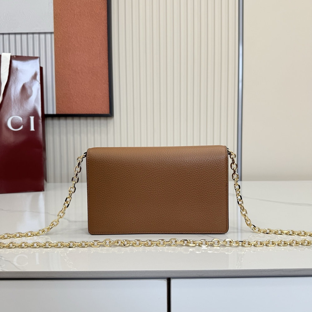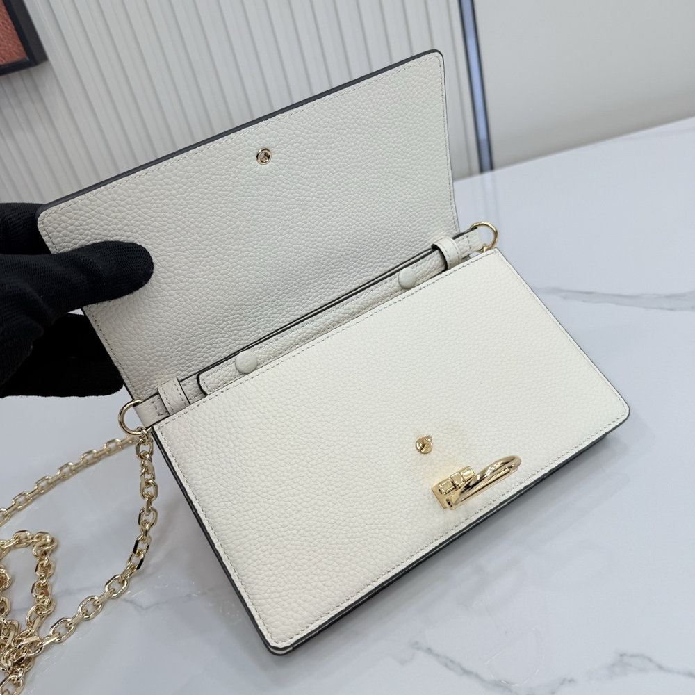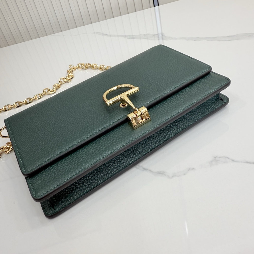 This sophisticated chain wallet is crafted from premium materials, offering a sleek and structured design that transitions effortlessly from day to evening. Its compact profile makes it perfect for carrying essentials while maintaining a polished and elegant appearance.