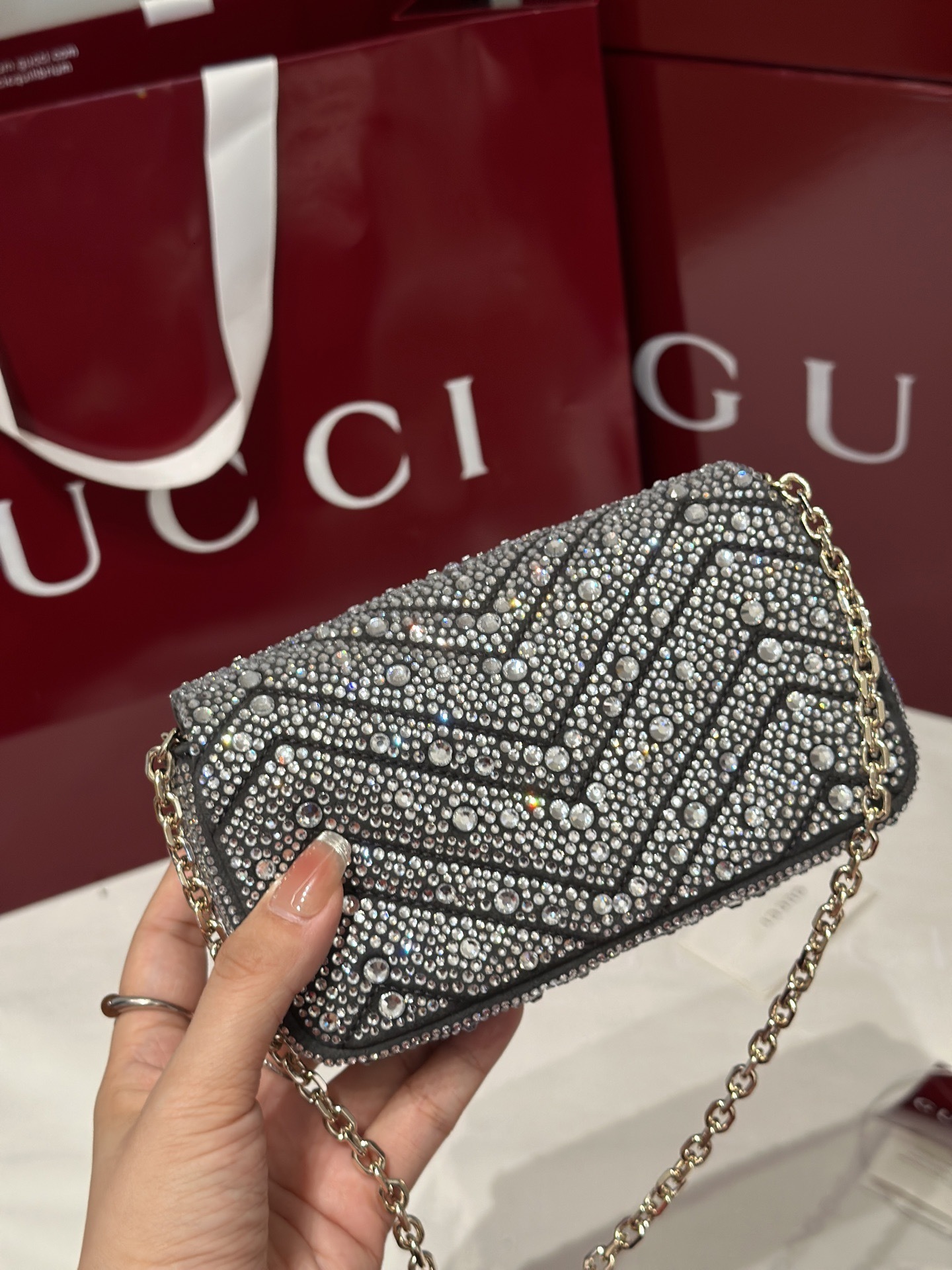 Whether worn to special events or styled into your everyday wardrobe, the New Collection Fashion GG Marmont Crystals Handbag KK03550-2 is a statement piece that captures attention with radiant sophistication.