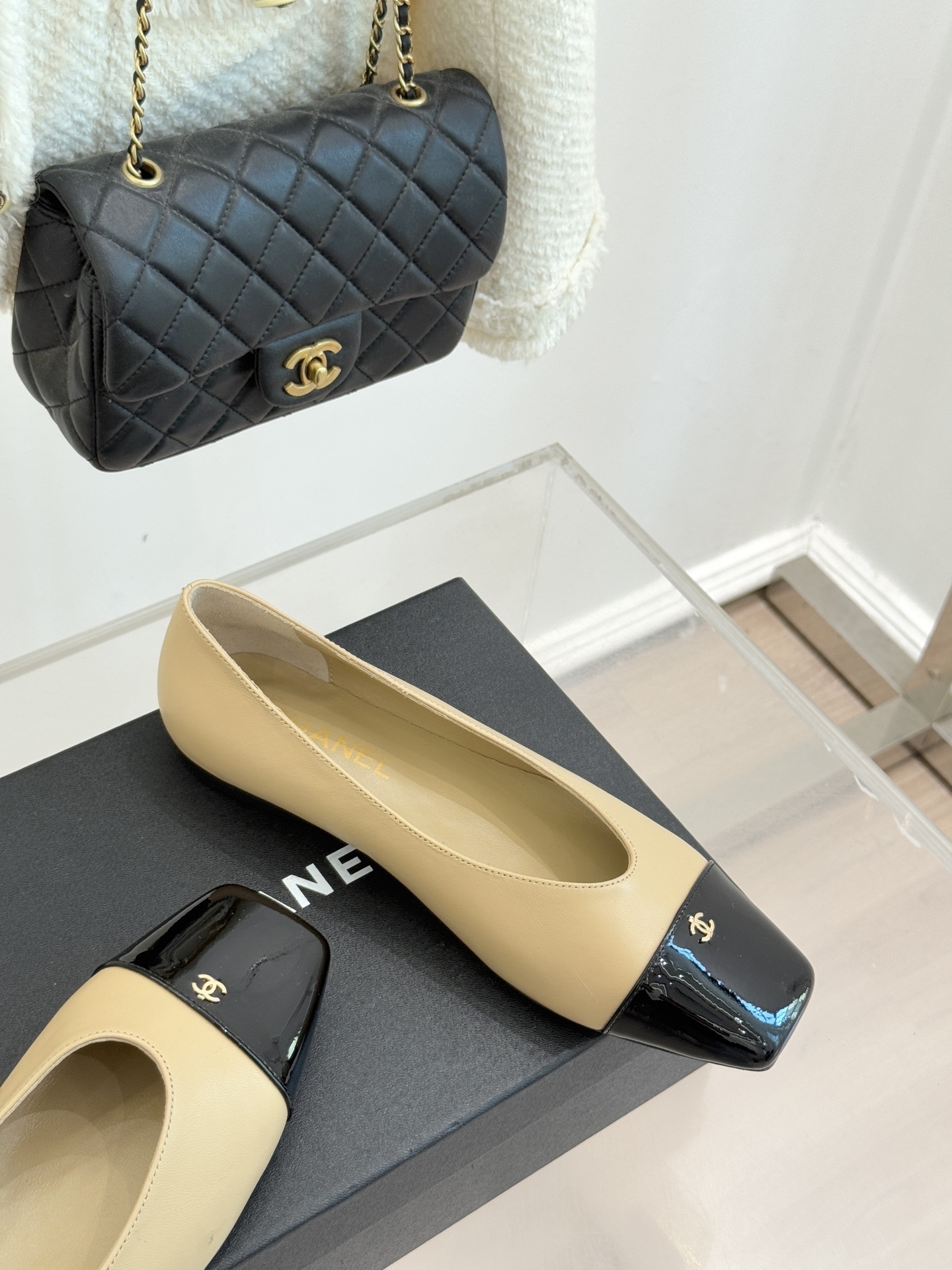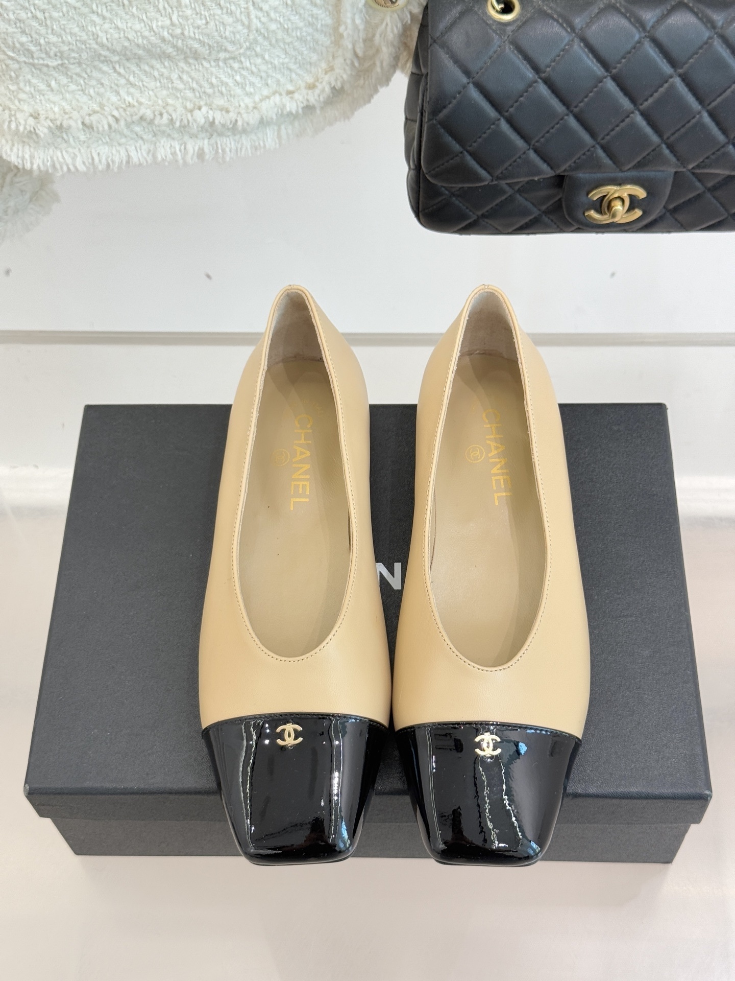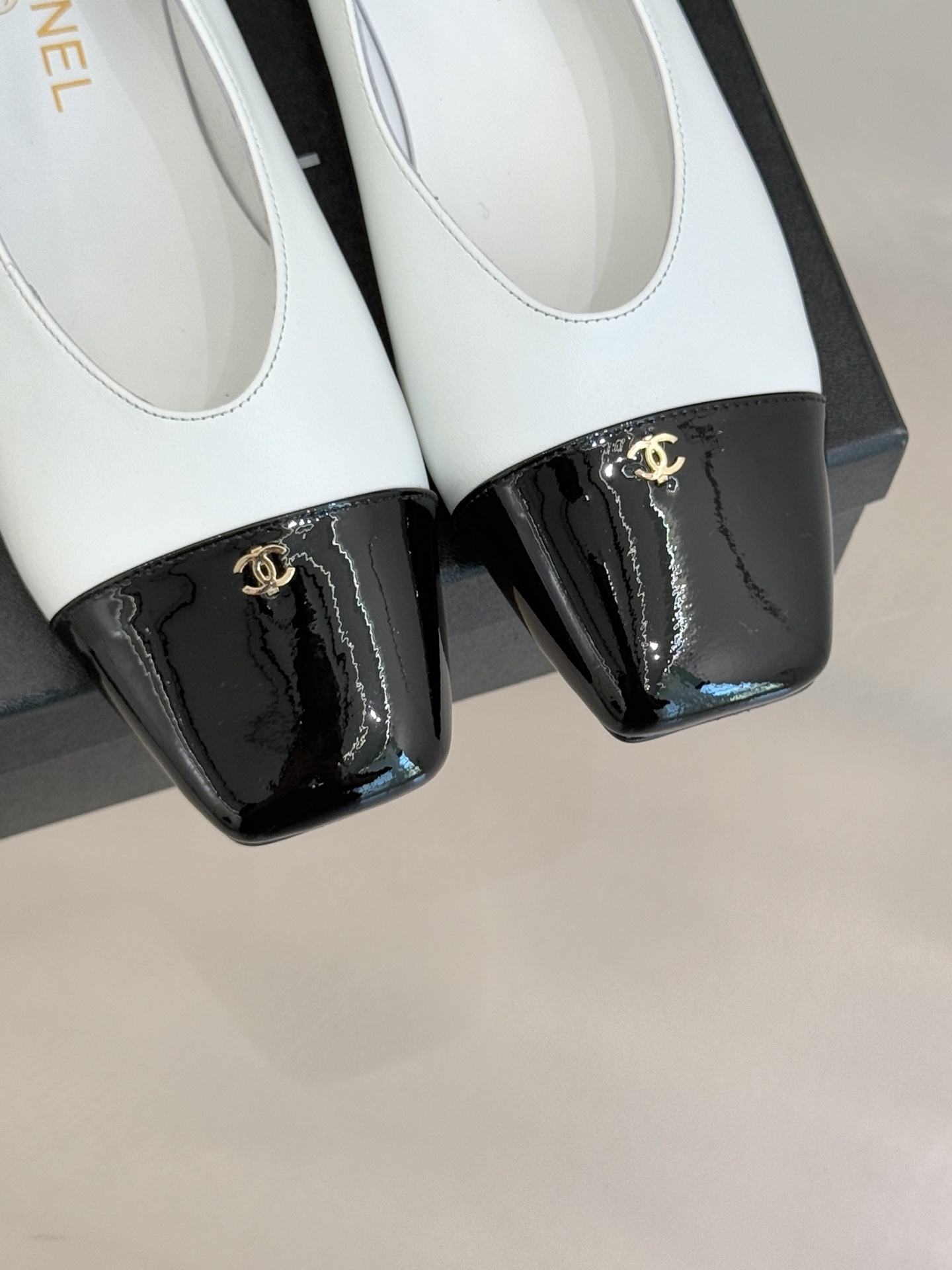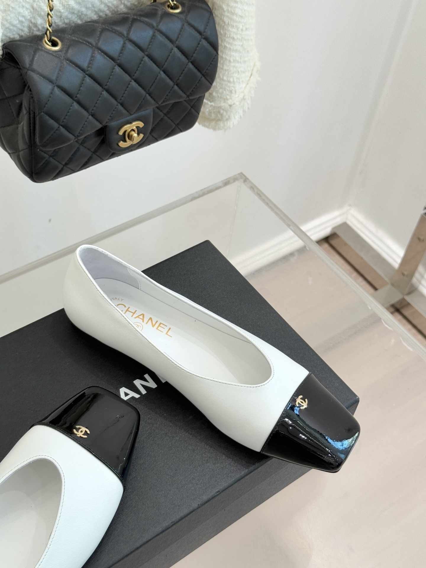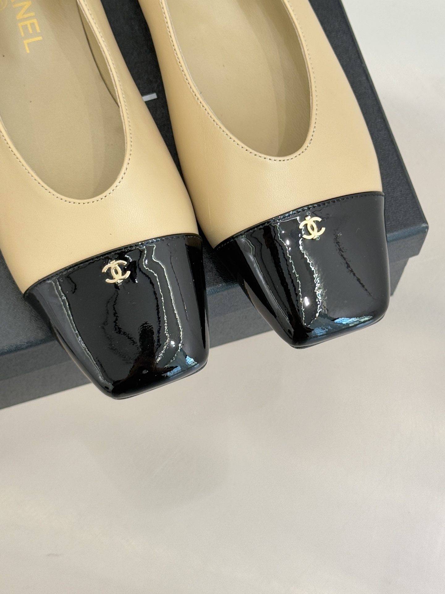 Chanel-inspired flats are known for their graceful silhouette and signature cap-toe design. This pair reinterprets that timeless look with a sleek square toe and glossy contrasting cap, creating a refined yet modern aesthetic. Available in neutral tones like black, white, and beige, these shoes are perfect for elevating any outfit.