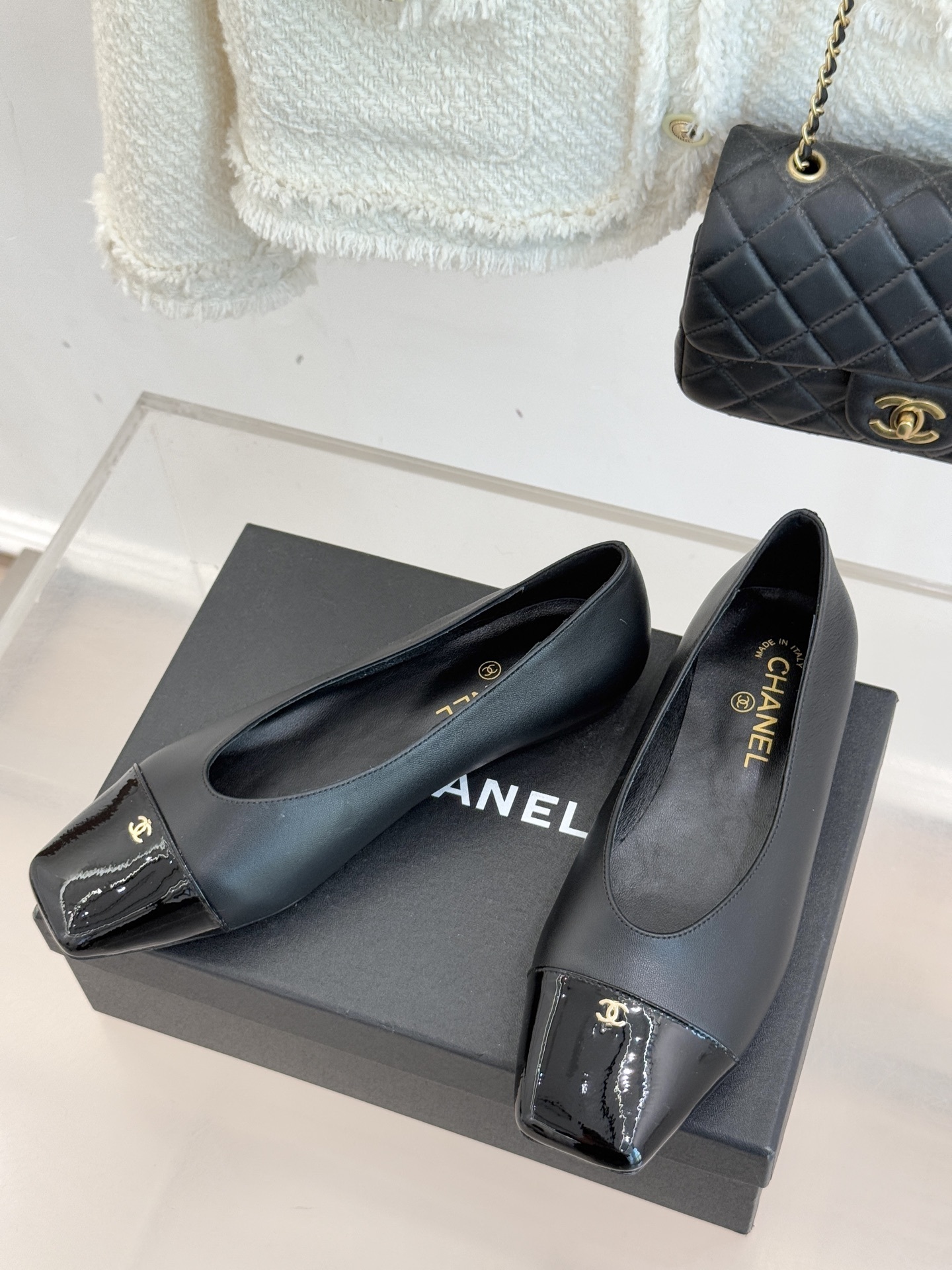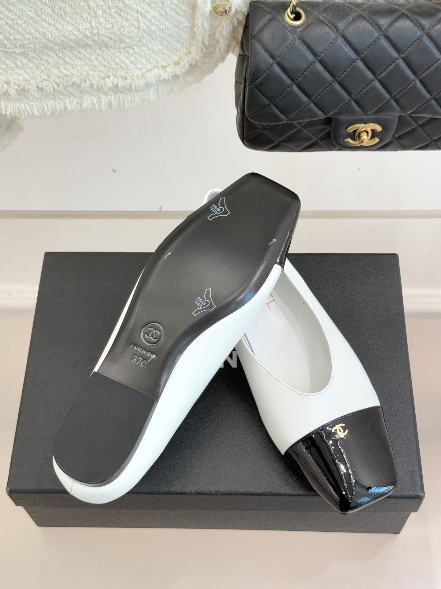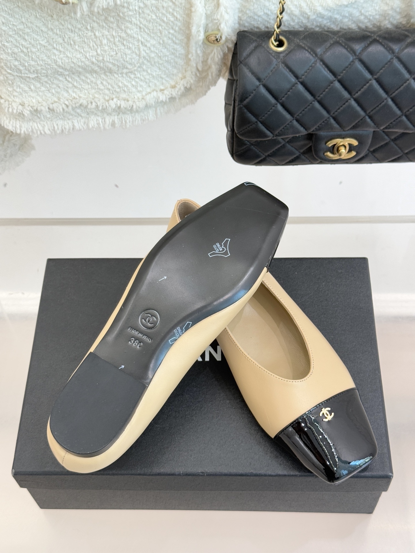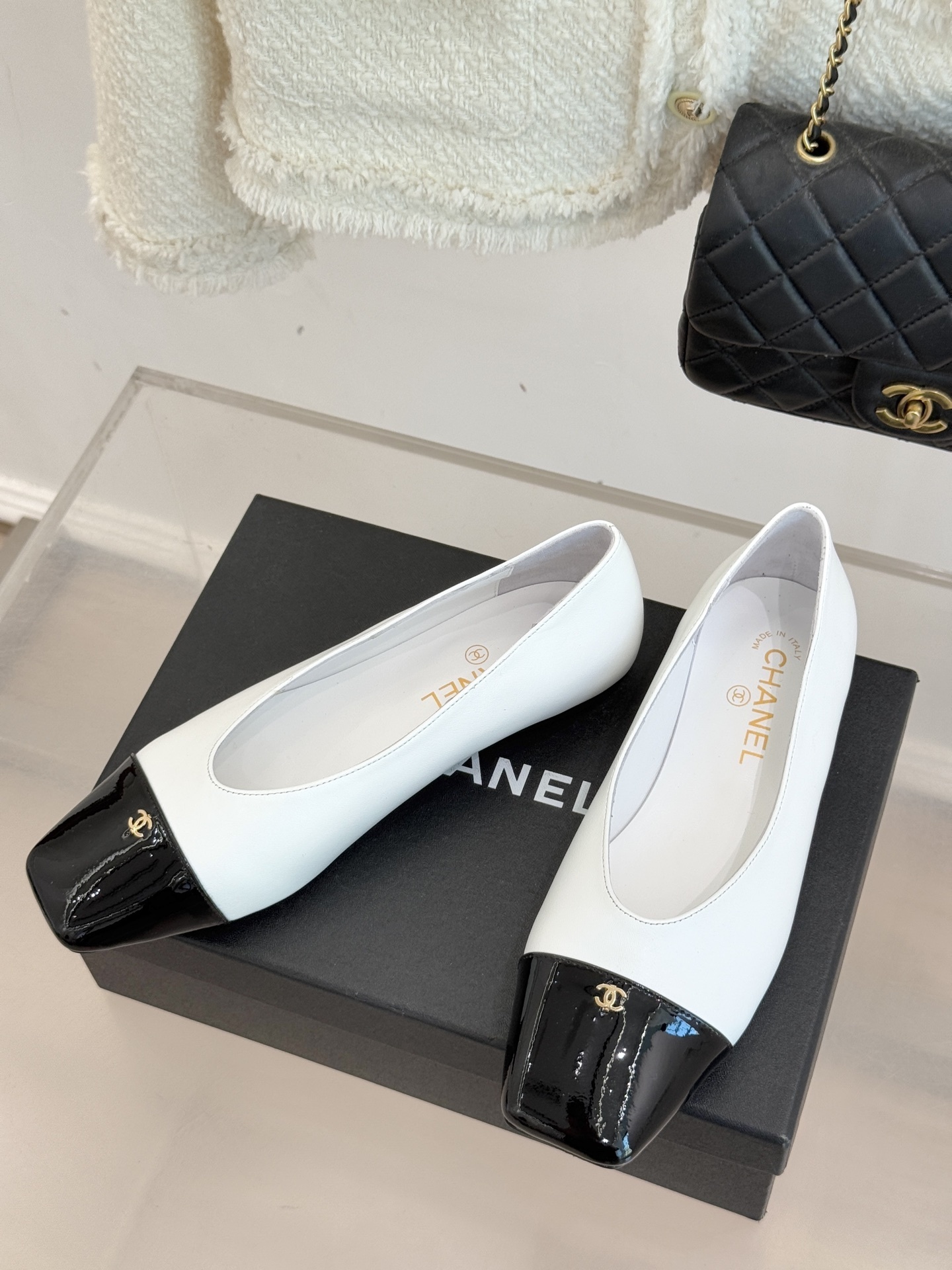 Chanel-inspired flats are known for their graceful silhouette and signature cap-toe design. This pair reinterprets that timeless look with a sleek square toe and glossy contrasting cap, creating a refined yet modern aesthetic. Available in neutral tones like black, white, and beige, these shoes are perfect for elevating any outfit.